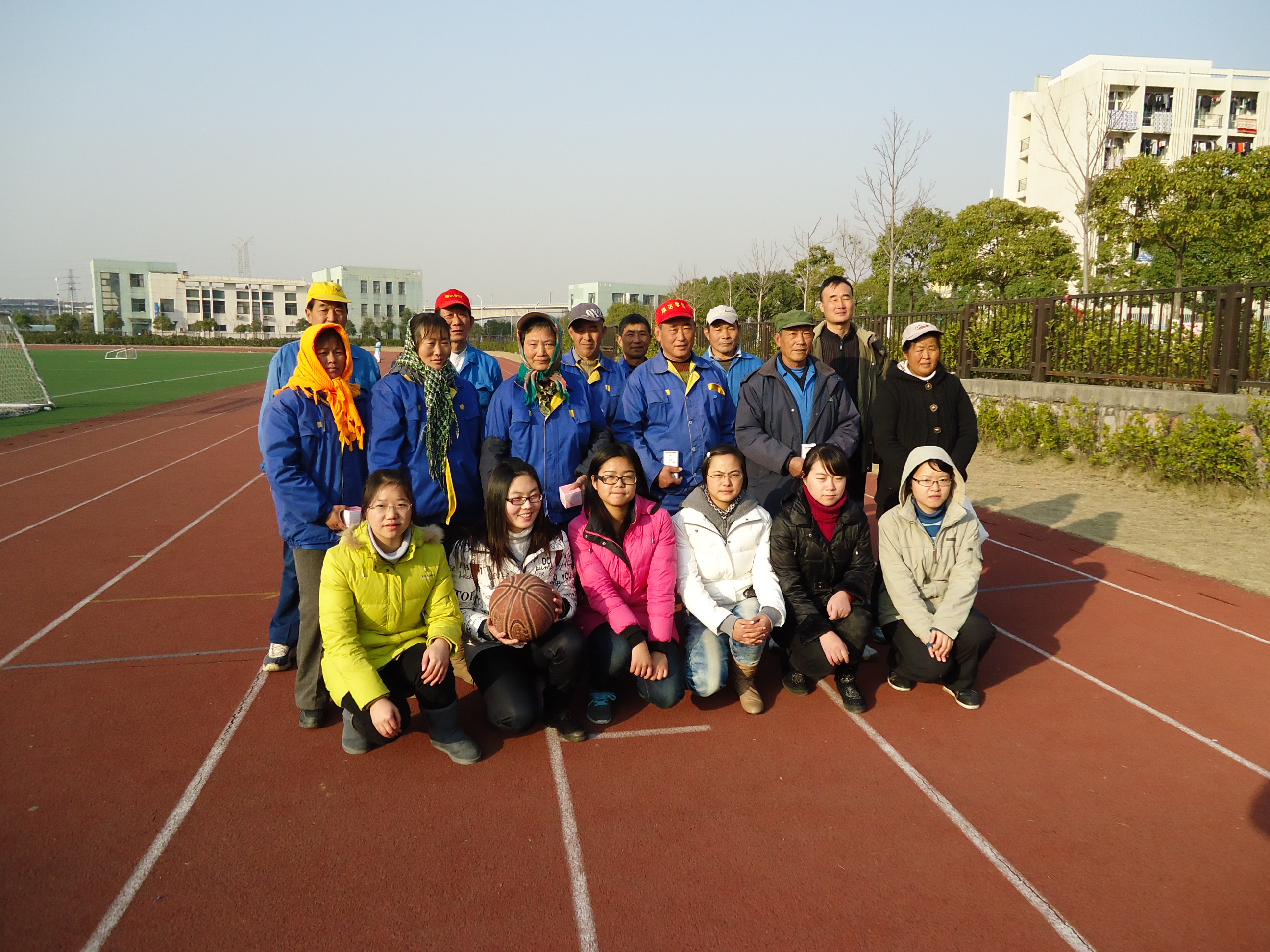 紧接着下午15:00左右,江宁校区米兰(中国)让运动改变生活的同学代表来到了田径场,慰问学校的绿化工作人员。为了增加工作人员与同学们的互动,我们组织同学代表和绿化人员一起进行篮球接力赛。简单讲述规则以后,比赛正式开始。别看那些叔叔和阿姨大都是五十几岁的人,一个个玩起来可是一点也不逊色,跑的一点也不慢。三轮下来,大家说说笑笑,特别开心。紧接着,我们把事先准备好的礼品发给了绿化人员,表达我们的感谢,是他们让我们的校园如此美丽。他们对于同学的慰问表示十分感动。