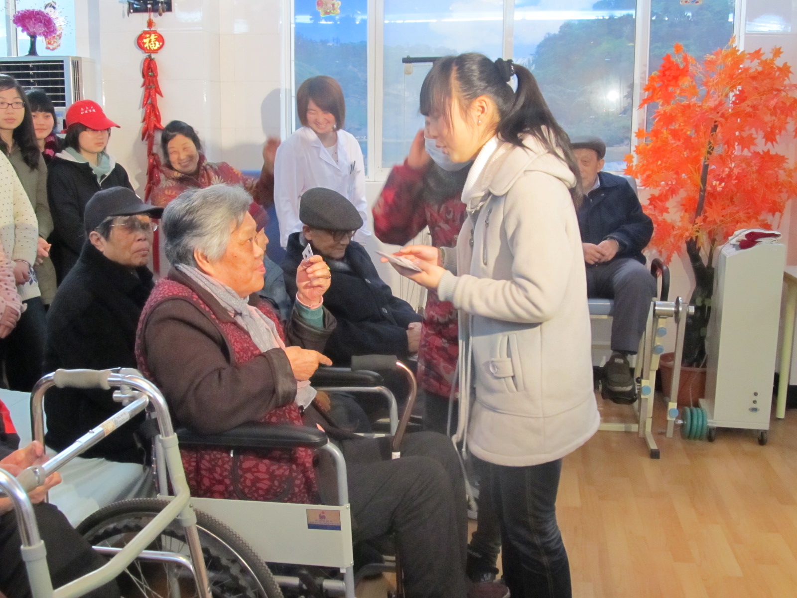 上午9点多志愿者们到达康复院,在“爱之源”代表姜宏椅和护士的带领下,把康复院的数十位老人接到一楼活动室。待老人安心坐下后,志愿者便开始了精彩的节目表演。带给老人们的是一首首欢快的歌曲,老人们纷纷随着欢快的节奏打拍子,沉浸其中,愉悦的气氛顿时洋溢在康复院的整个活动室。此外,俞俊俊同学的魔术表演更是把整个活动室的老人给逗乐了。还有一些志愿者表演了昆曲《春江花月夜》和黄梅戏等戏曲,不仅逗得爷爷奶奶们哈哈大笑,赢得爷爷奶奶们的一致好评,还将整个气氛推向了高潮。到了最后,康复院的窦奶奶趁着雅兴唱了一首《唱支山歌给党听》来表达他们对志愿者们的欢迎和谢意。等一切表演结束后,志愿者们分成若干个小组分别将老人们送上楼,并留在房间里和他们拉起手话家常,场面很是温馨感人。从谈话中志愿者们发现,天山路护理院里的工作人员照顾老人们都很细心周到,无论是送药还是送饭,都是客客气气的,对老人们很有耐心,因此老人们都很健康,精神矍铄。