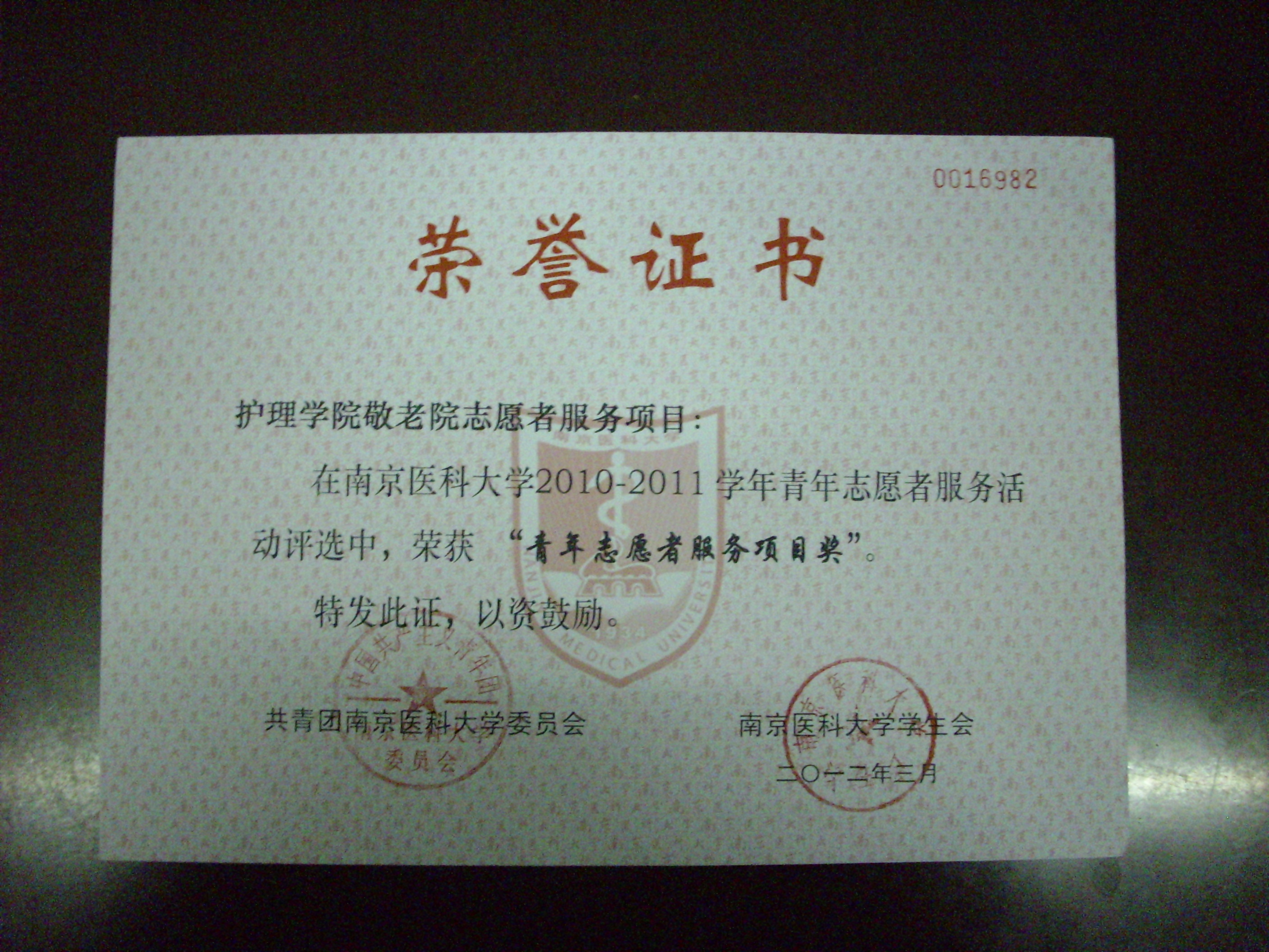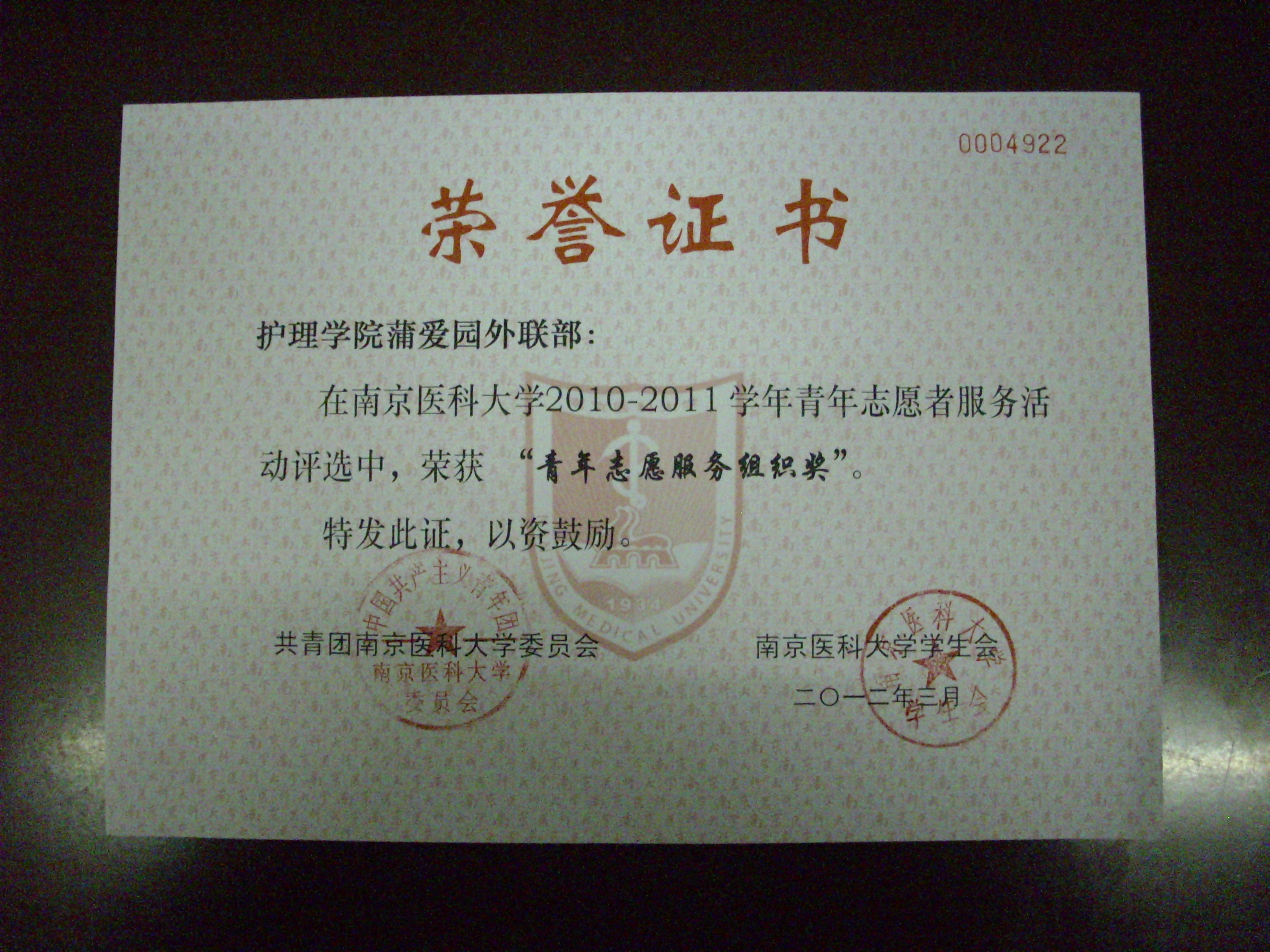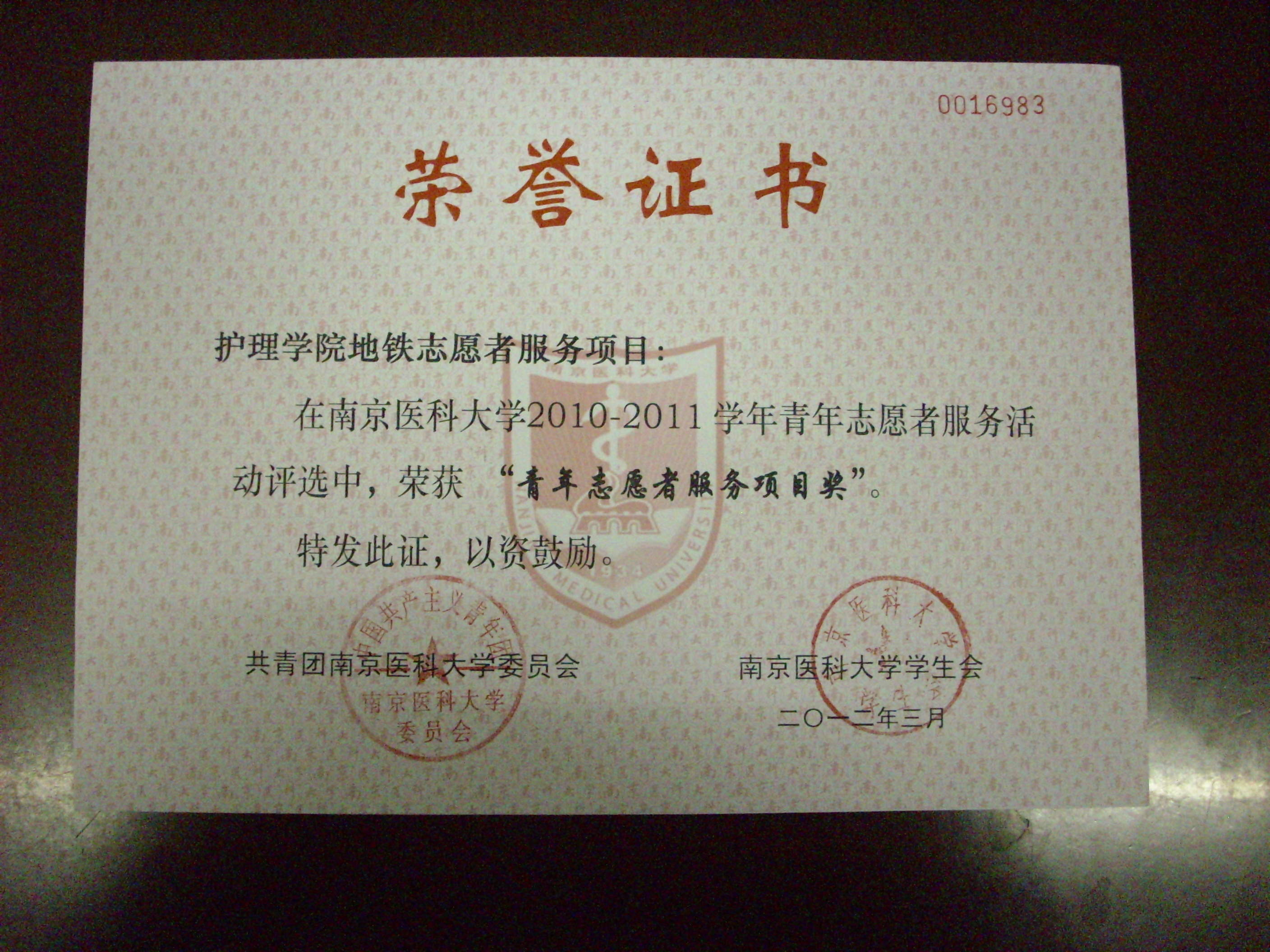 在2010-2011年度,我院“蒲爱园”的志愿者们在地铁站志愿服务共计24次。其间,志愿者们耐心且细致地为地铁上来来往往的乘客们指路、解决疑问。同学们不畏辛苦劳累,时刻带着微笑,为前来询求帮助的人们排疑解难,她们的热情服务和贴心帮助更是得到了广大市民的称赞和表扬;与此同时,志愿者们还自发的走进养老院和儿童医院,为孤寡老人和病弱孩童带去爱心和温暖,编排节目陪老人话家常,贴心服务为家长解难题。可以说,我院“蒲爱园”的志愿者们秉承着“助人为乐”的坚定信念,利用业余时间尽心尽力的为社会志愿服务贡献着不可忽视的力量。为此,校团委特别授予我院“青年志愿者服务项目奖”的荣誉证书,认同和赞扬我院志愿者们在2010-2011年度的志愿服务活动;除此之外,共青团南京市儿童医院委员会还将在其2011年季度秋季志愿者服务活动中表现优异的我院的志愿者们评为“优秀志愿服务团队”,可喜可贺。在上周“蒲爱园”开展的养老院志愿服务活动中,我院的志愿者们还接受了江苏教育台的采访,志愿服务的精神得到了进一步的认同和宣扬。