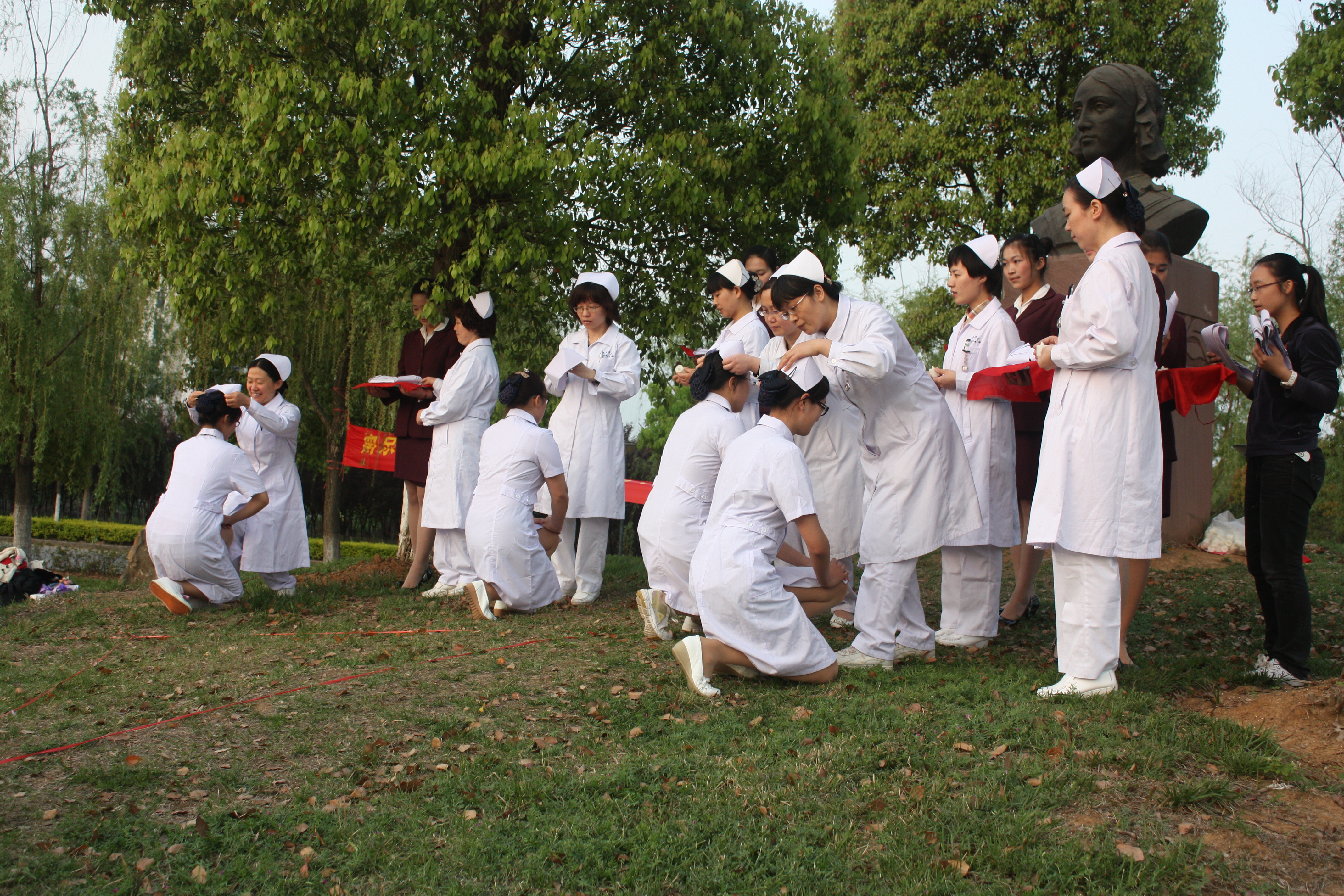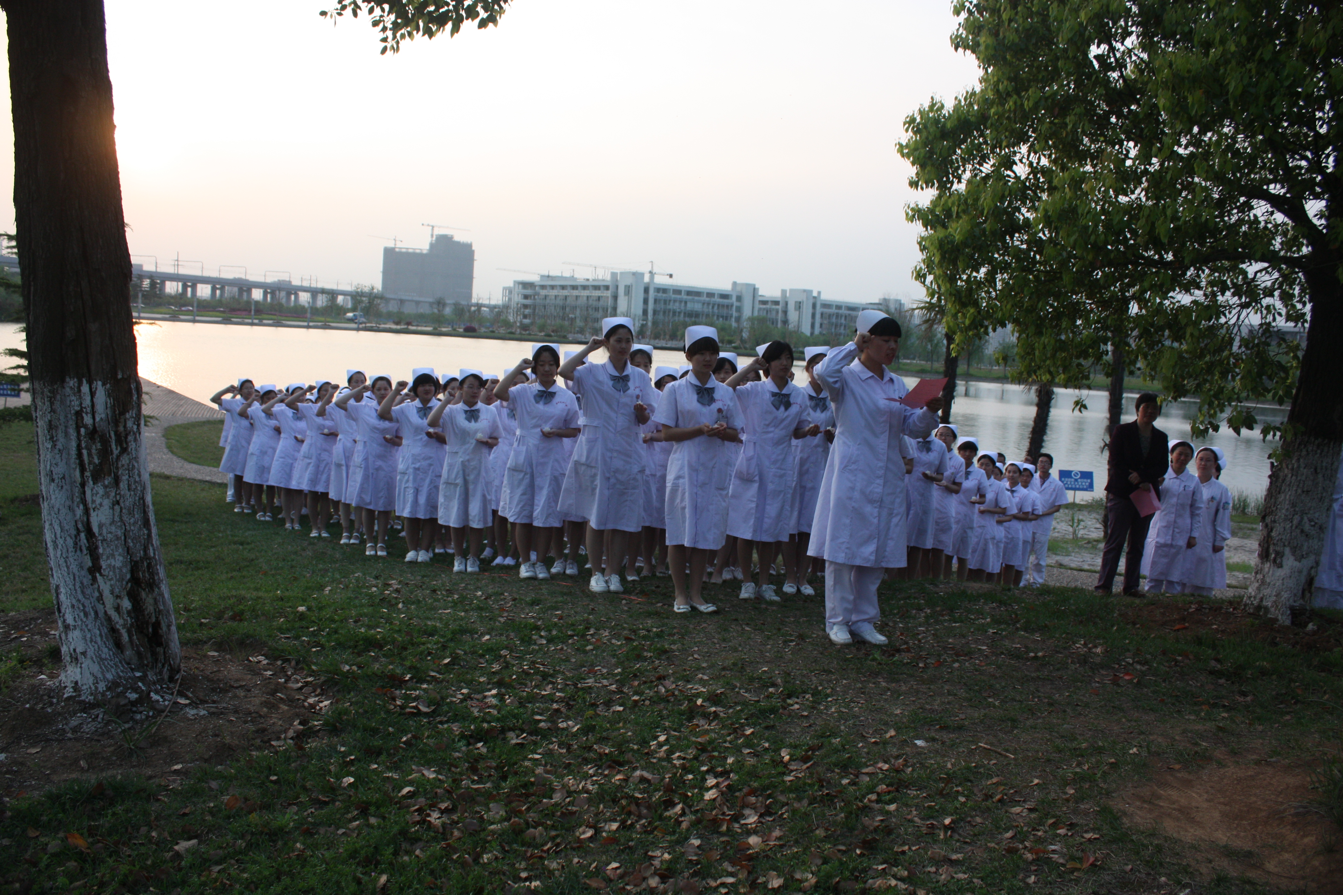在南丁格尔的雕像前,伴随着音乐,09级护理同学在护理前辈面前,由老师们为她们戴上圣洁的燕帽,同学们接过老师手中的蜡烛,在孙国珍老师的带领下站在南丁格尔像前庄严宣誓。