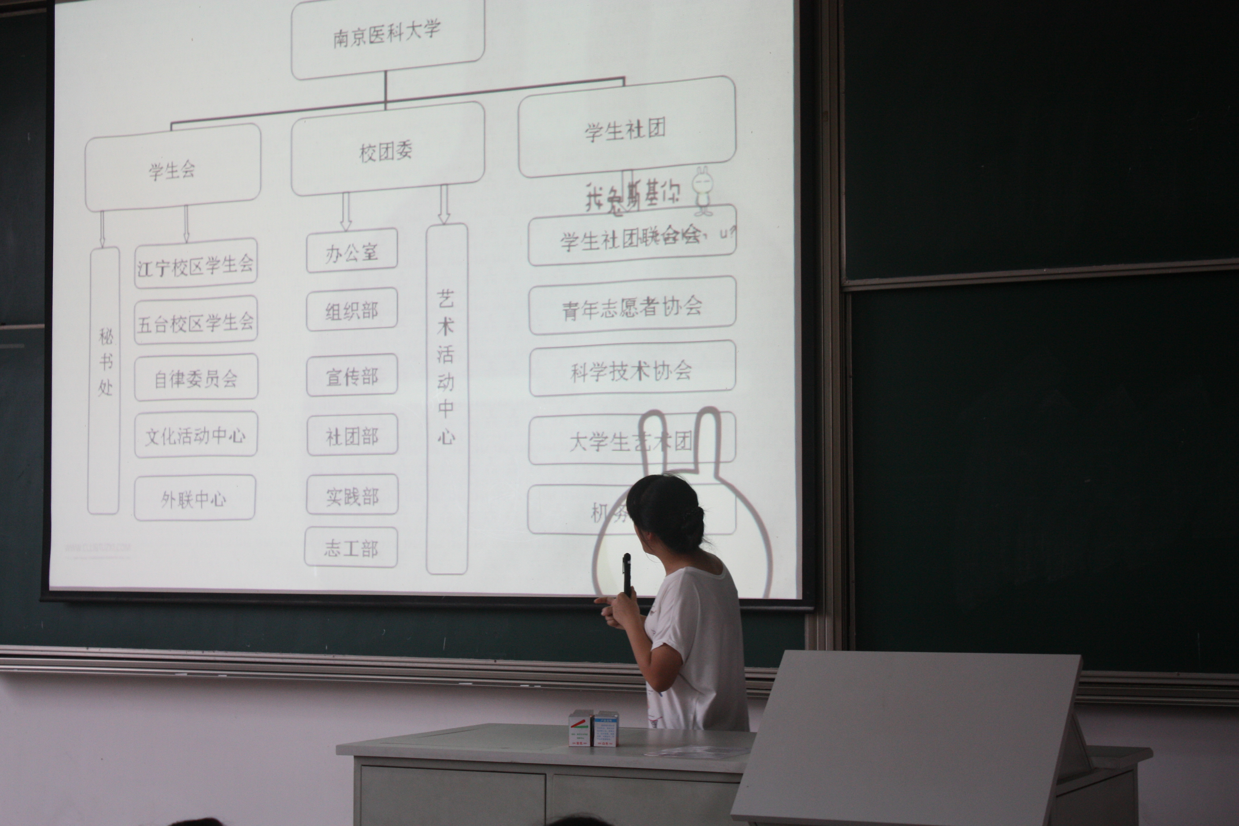 接着关于大学学习刘同学就给新生们打了“预防针”,告诫他们不要认为大学很轻松,进了大学就很自由,并讲明了不好好学习的严重性,例如挂科、修不满学分而拿不到学士学位证书……提到挂科,对此刘文辉列举了大一上学期最常挂的三门,即高数、医学化学和细胞生物。还提了我们学校著名的四大名“补”:生理、生化、药理、病理以及校园里流传的“三理一化,必有一挂”。这让新生们首先意识到这些科目的重要性。并提醒他们可以去找学姐学长们借资料,向他们咨询问题等。不过,让新生们恐惧了这么久,刘文辉补充道:“只要好好学习,考试还是都可以过的。并且我们学校有良好的氛围,例如图书馆,自习教室”。谈及图书馆,刘文辉简单地介绍了图书馆,少不了提醒考试月图书馆的人山人海。医学生少不了提些特色课,当刘文辉同学讲到解剖蟾蜍、兔子,互相静脉注射时,很多新生惊讶、害怕,当然更多同学是感兴趣。讲了这么多学习严肃之事,刘同学接着讲了轻松休闲的校园文化活动:篮球赛、服装搭配大赛、江宁告别晚会……并且劝新生们多出去走走,班级出游、组队游览六朝古都的名胜古迹等。最后,由副主任刘丹妮为新生们介绍了校院级机构。