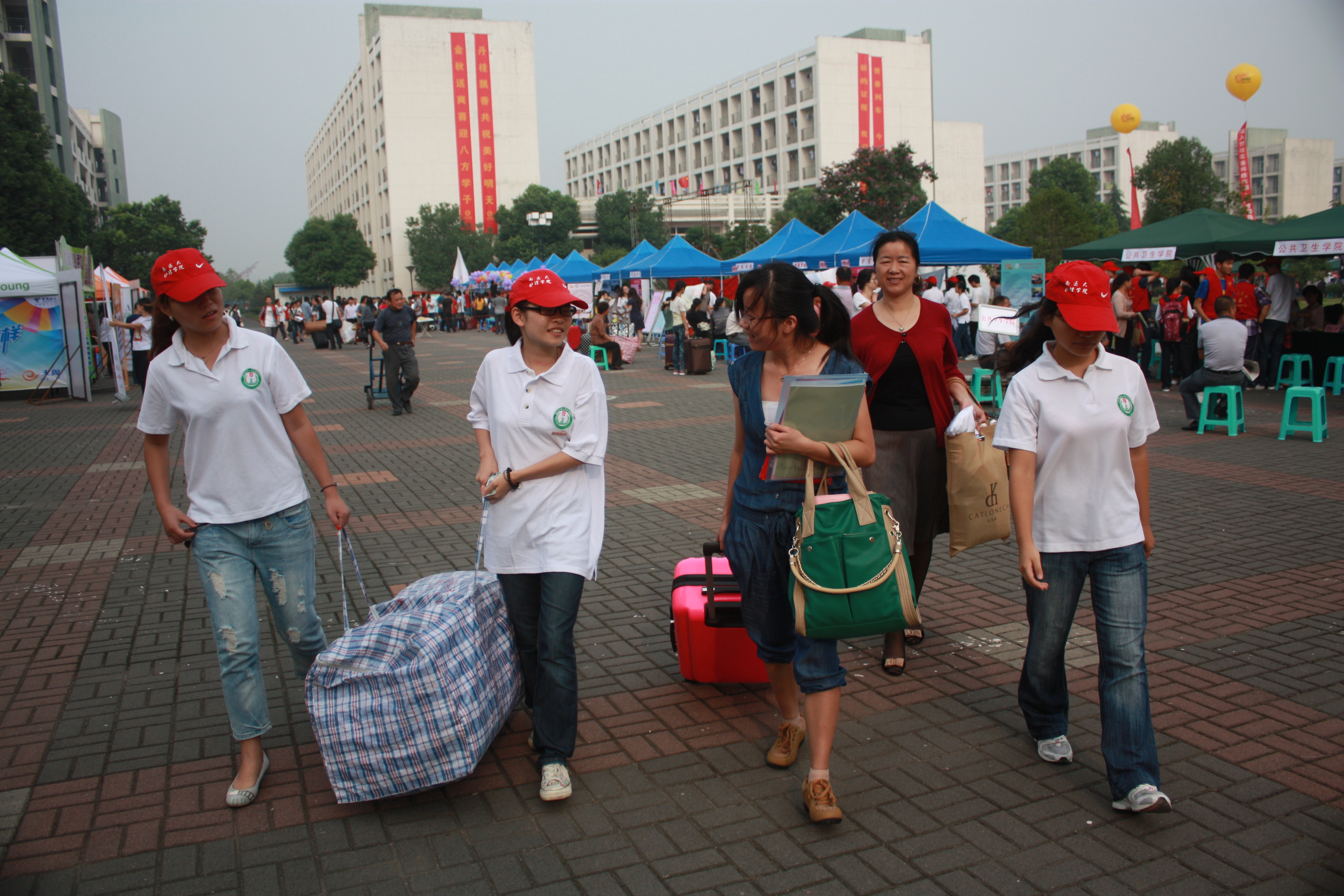 虽说还不到七点,前一天就到的新生及家长们已早早地在报到处候着了。志愿者们赶紧展开行动,有的上前主动询问,有的主动去搬凳子给家长坐,有的领着新生到指定班级去报到注册……多数的志愿者见新生及家长们提着那么重的物品,都会主动帮他们提着物品直到宿舍。经常见志愿者从宿舍楼上下来时就会气喘吁吁,真是辛苦。偶尔也会听到一两句志愿者的“牢骚”:提着东西爬到五楼,累死我了!之后又会投入到工作中。有时觉得她们是在比赛一样,看谁领的新生多似的。其实领的新生再多都一样,不会因为多而好处多,但是她们仍旧那么积极,甚至连水都来不及喝。因为她们内心觉得快乐,再苦也值!