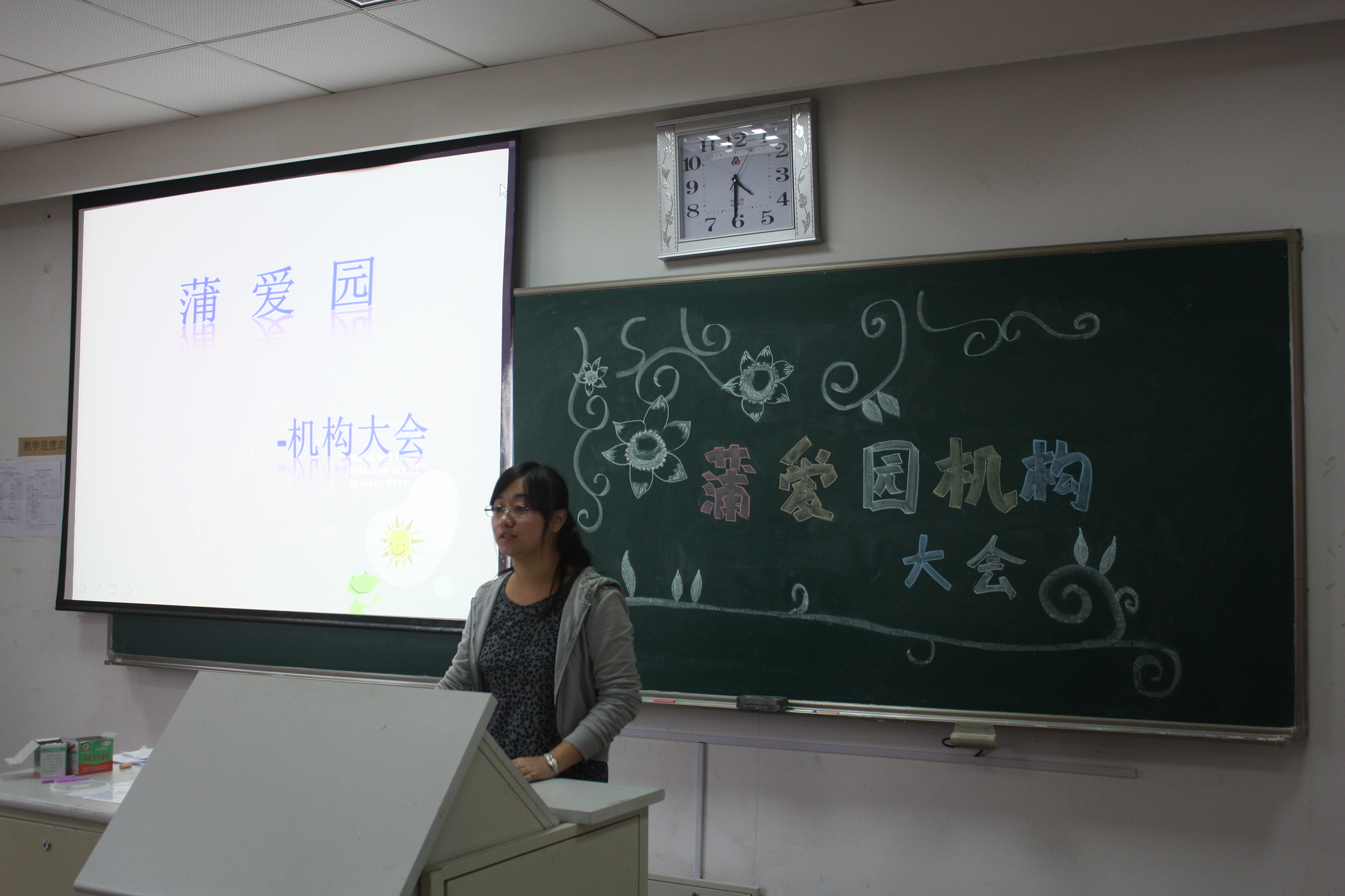 蒲爱园分为自励部,基金部,助学部以及外联部,为了让各部门的干事互相了解,大会以新干事的自我介绍开始,随后是主持人孙芳总结了上学期各部门的各项成果,可谓是硕果累累。期间还播放了上学期蒲爱园各项奖项获奖人的获奖感言,由此可见蒲爱园在学院中的重要性。接着由各部门的部长向新干事们介绍各部门的历史及分工。然后,主持人孙芳还做了校运动会的动员并公布了有关运动会的安排,其次是对2012-2013学年工作的安排,最后让大家来总结本次会议,陈学灵等人依次发了言。蒲爱园涉及的方面很广,有着我们不知道的内蕴。