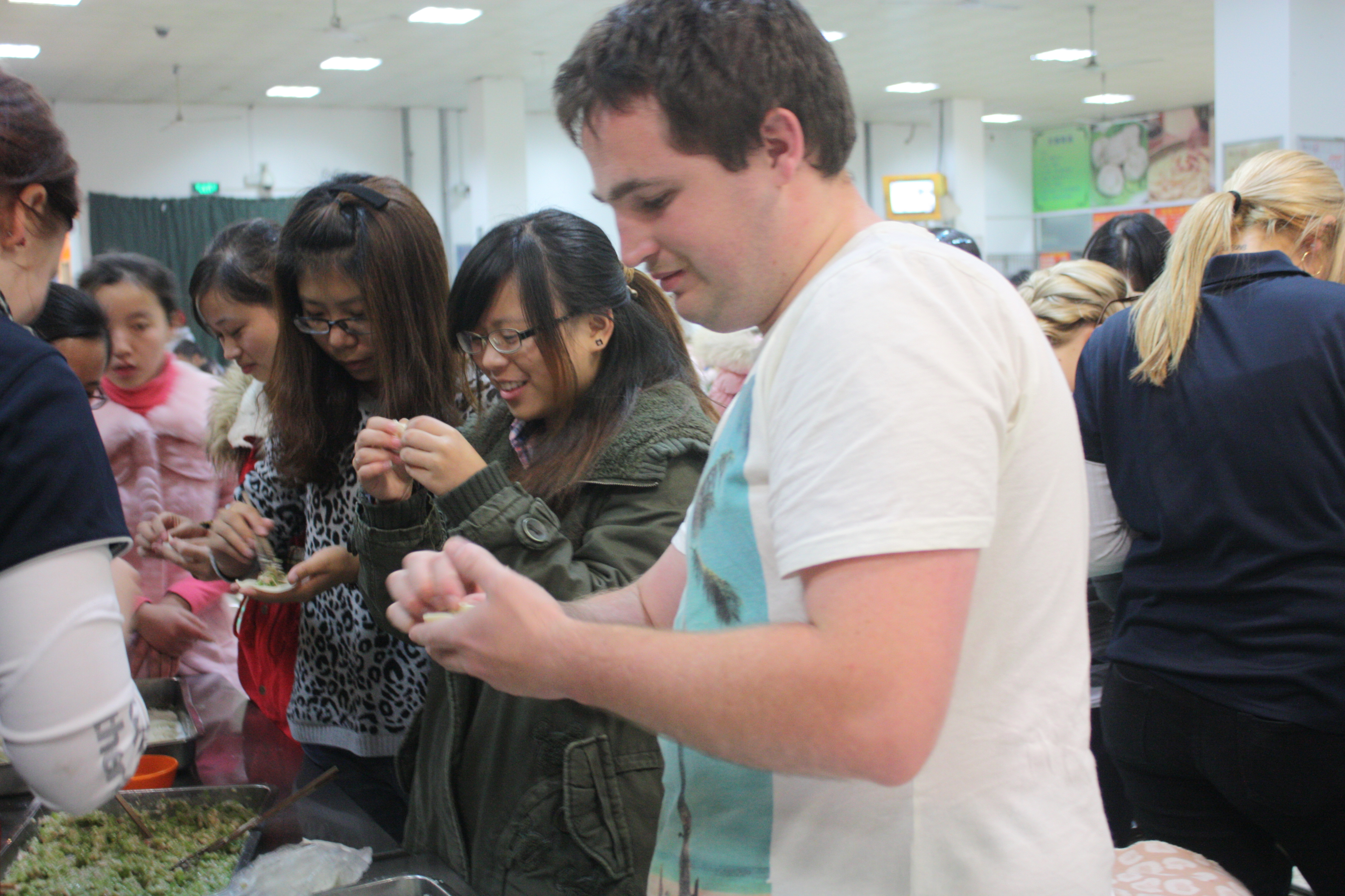 随后大家来到了学校的三餐,开始今晚的中国传统饮食文化的交流——包饺子。在准备好了一切先前条件后国外友人们和我们的同学们便兴致勃勃地撸起袖子,左手托着饺皮,右手挖着馅,热火朝天地包了起来。大概因为很多人从来没有包过饺子,再加上几个“门外汉”,大家包出来的饺子千奇百怪,还被冠以了各种各样有趣的名字,比如将两张饺皮捏在一起的“太阳花”,捏成包子样的“包子”,还有捏成四边形的“不知名”……在同学们的欢声笑语中,终于完成了所有饺子的制作。看着满满四盘形态各异的饺子,大家既兴奋又觉得搞笑,还有的人声称着待会肯定不吃自己包的饺子。在所有人饥肠辘辘貌似过了千年的等待后我们的饺子终于出锅了,不出所料的是在饺子的底下飘着一层“菜汤”,还有的饺子露出了肚皮。蘸着醋,吃着热乎乎的饺子,每个人都洋溢着灿烂的笑容,暖暖的水流过每个人的心田。