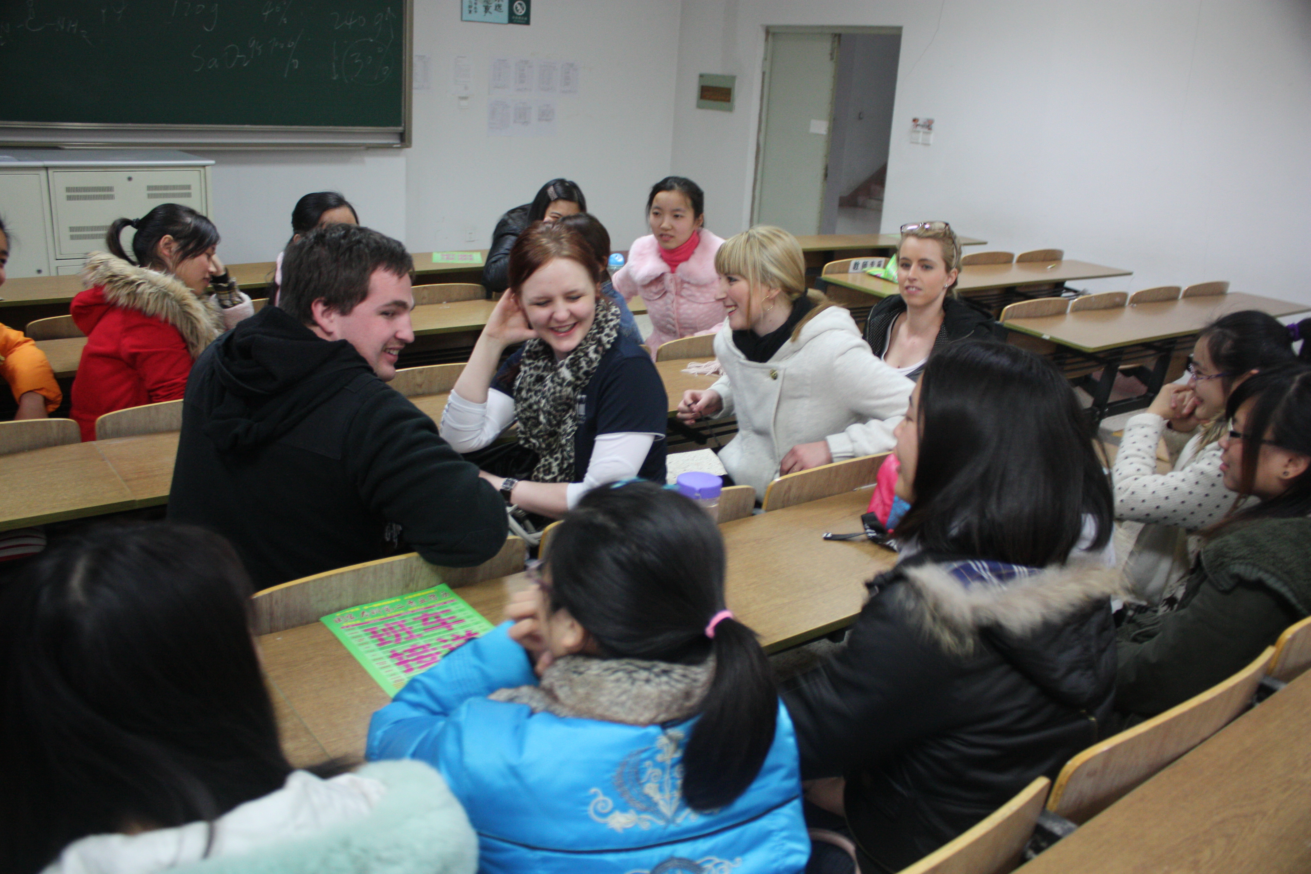 伴随着一声声惊叹,我们迎来了来自澳大利亚昆士兰大学的四名交流生。面前所见的三女一男的组合让所有人都眼前一亮——白皙面容立体五官——完全迥异于东方人的水墨书意。在随后的交流中,她们的随和善谈也让大家之间的距离拉进了许多。虽然我们的英文发音并没有那么标准,但是每个人都很积极地与他们交流,分享彼此的文化和生活。虽然在文化、语言上彼此之间还有很大的差异,但是只要有一个有爱的心,心与心之间将不再有间隙。