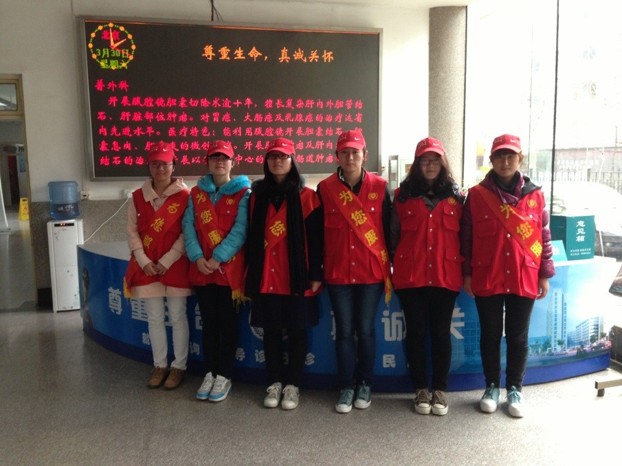 志愿者们到达医院时还不到8点,而一楼的收费处已忙得不可开交。上午8点整,志愿者负责老师王老师对初来乍到的同学们做了简单的培训。大家穿上红马甲,戴上小红帽,熟悉自己岗位职责后,志愿活动正式开始了。一楼大厅有一人,负责给前来就诊的病人指路;一楼的输液厅有一人,负责观察病人,将信息及时反馈给负责老师;注射处有一人,负责替不方便的病人拿药水;二楼、三楼分别有两人、一人,来回轮转,为病人指路,礼貌规劝病人及其家属保持安静,切勿吸烟。大家各司其职,认真负责,微笑服务,得到了病人、护士的好评。上午11点半,活动结束了,大家拍照留念,领着餐券高高兴兴地奔向医院的餐厅。