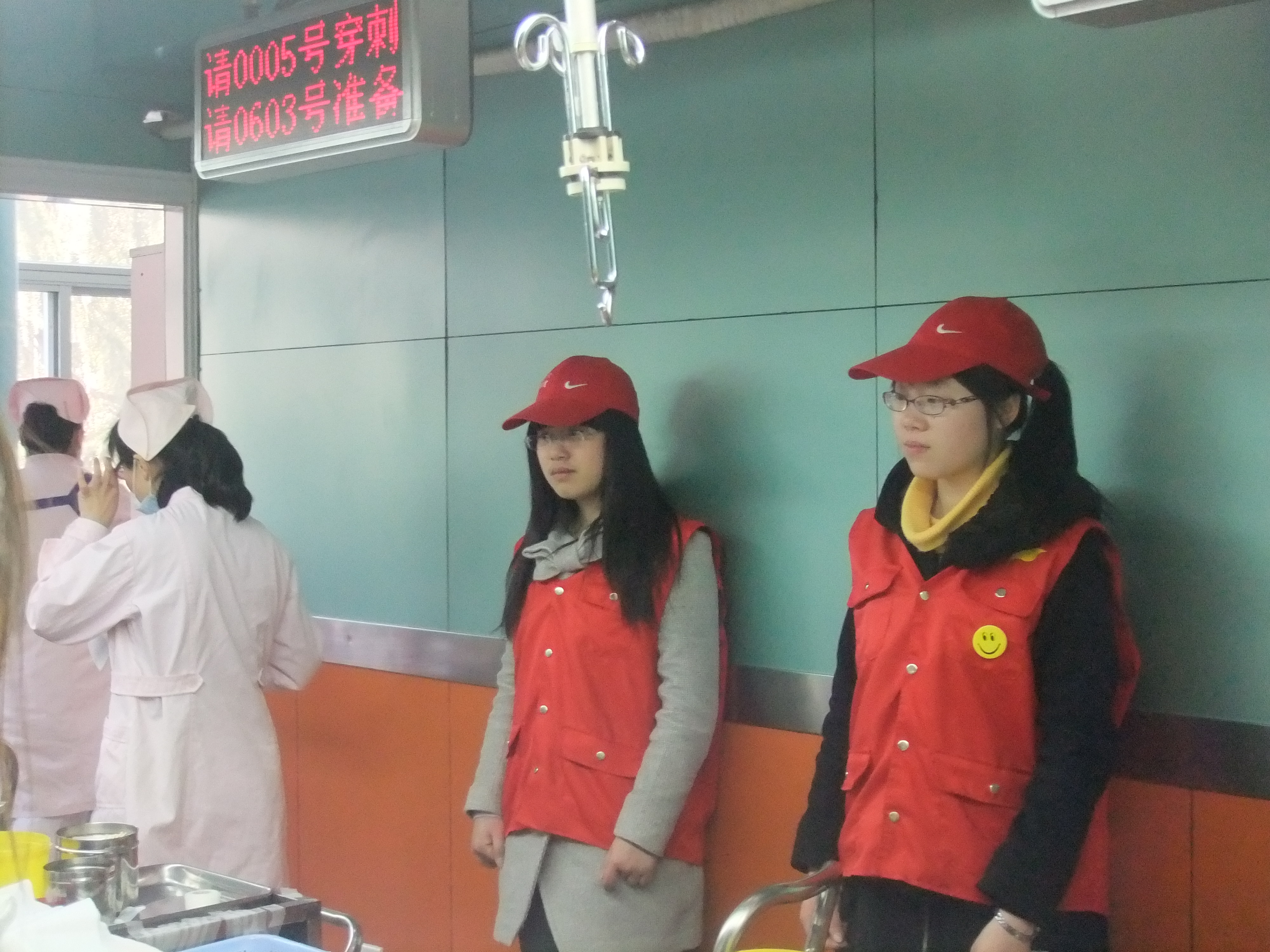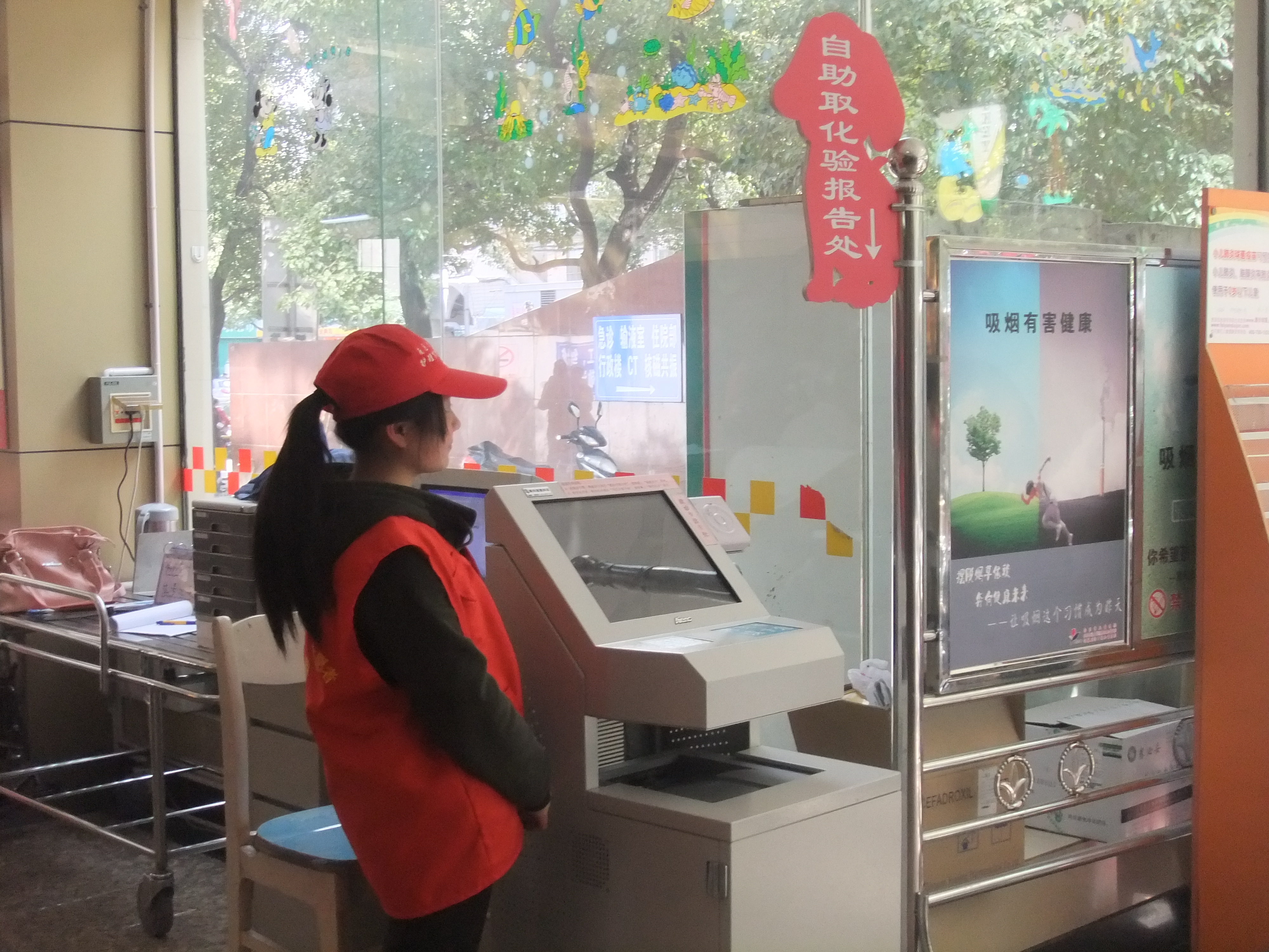尽管不是星期天,儿童医院的门诊部依然一片忙碌,穿好志愿者服装后,四人立即投入到工作。医院的老师将她们分配到不同的岗位,刘君茹在服务台协助医院的老师出售病历本并指导家长正确填写基本信息,梅峰在门诊指导家长打印化验报告单,孙淑和沈裕在二楼的门诊收取病人的病历及挂号单,依序排列叫号,维持病人的就诊秩序。刘君茹和孙淑都是第一次做志愿者,难免都有些紧张,在医院的老师们悉心指导下,很快她们便熟悉了工作内容,融入了工作,并自如地与病人家属进行交流,为他们导医。