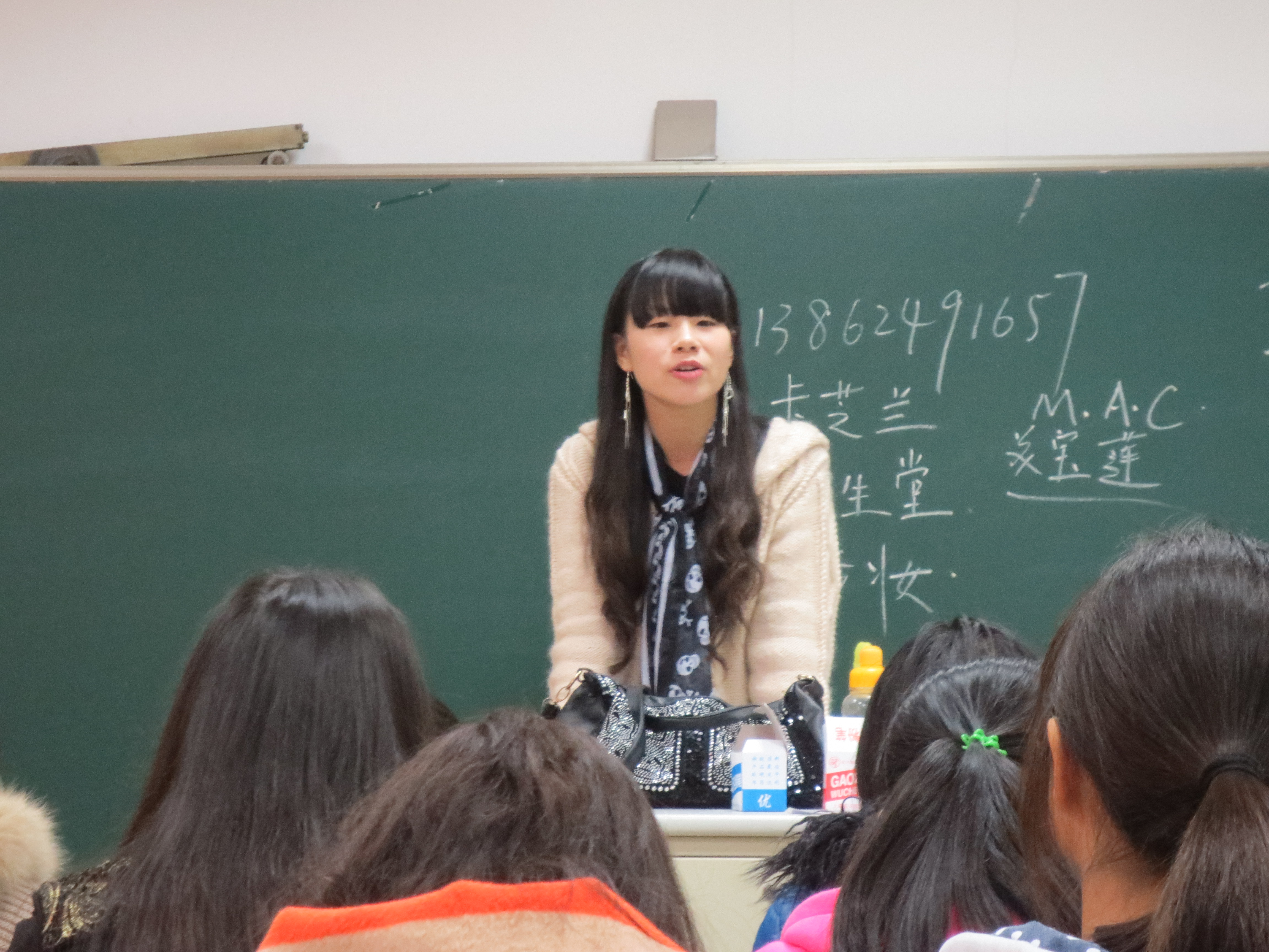 今天来上课的老师是一位学姐,系南京医科大学的学生。第一次课时很短,老师说就相当是一个动员大会吧。在做了自我介绍之后老师很快地转入了正题。她说上课的同学基本上都没有化妆,都是素颜,但是大家要意识到化妆对于一个女生是十分重要的,护士在工作时不仅仅要把脸露出来,有时额头也要露出来,因此皮肤的保养对于护士来讲更加重要。然后老师又介绍了化妆的硬件,从打底霜到腮红,从睫毛膏到唇彩,可谓是面面俱到。之后,老师又介绍了几款不错的化妆品,她强调:女生在选用化妆品时一定要从自己的肤质出发,在买化妆品之前一定要先搞清楚自己的肤质,而且在用一种新的化妆品之前要先试用。同学们听得都很认真并且做了笔记,还不时地提出自己的疑问,整个课堂氛围十分活跃。在介绍完各种化妆品之后,老师表示希望同学们在下一次课的时候能把化妆品带过来,到时候会教给大家一些打底,上妆的技巧,并教授化彩妆的技巧。