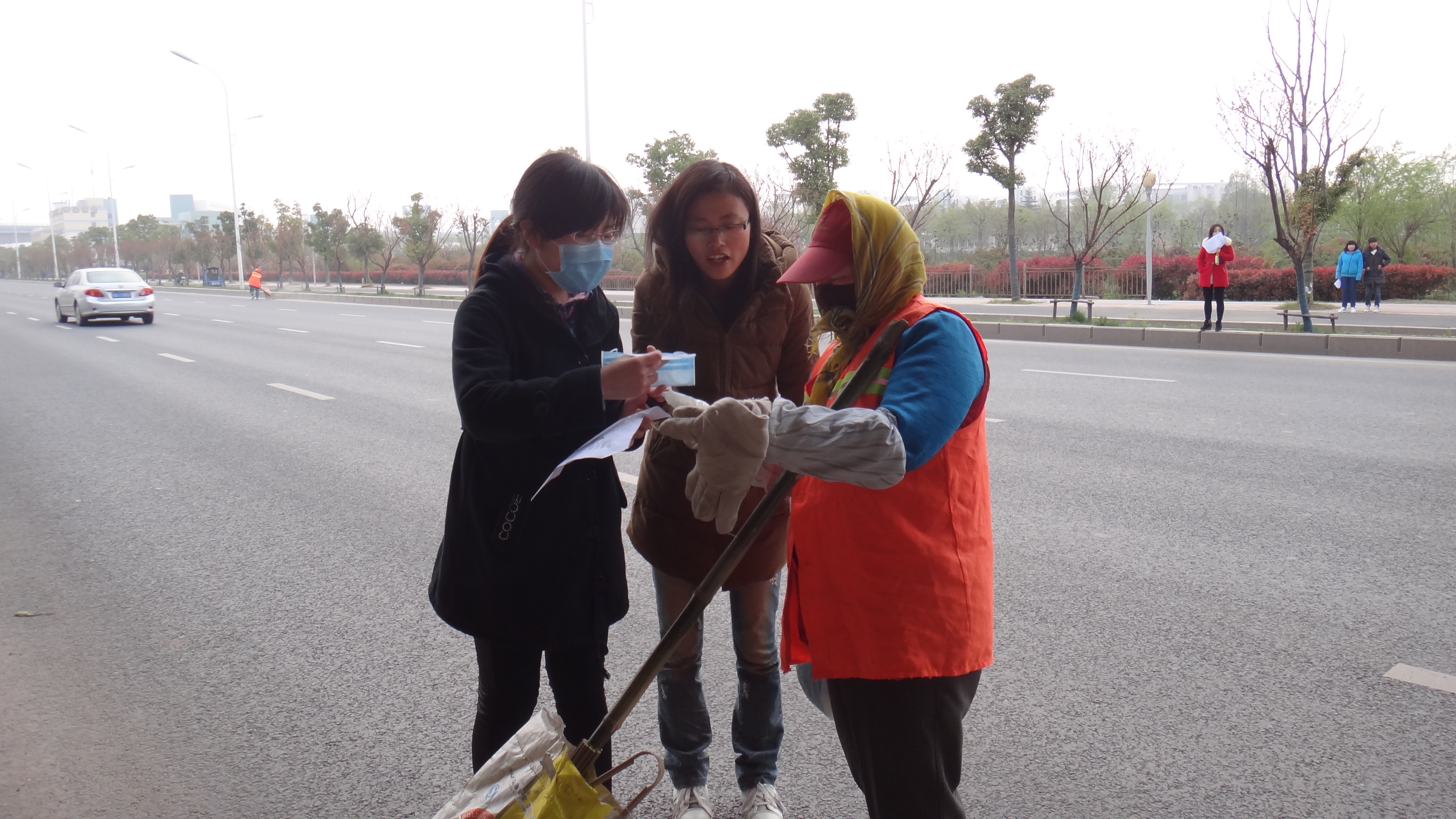 早上7点,所有人员在一餐门口集合,合影结束便分成两队成员开始进行我们的活动。一队往文鼎方向,一队往义乌方向。大家带着宣传单与口罩沿途寻找着环卫工人们。他们一个个身穿黄色马甲,包裹严实挥动着手中的扫帚。我们拿着口罩,耐心地为他们讲解口罩佩戴与清洗消毒方法,他们大多都感动地接过口罩,并连声道谢。也有少数人由于自己的身体状况,不方便佩戴口罩婉言谢绝了我们。我们走过一条条大道,不厌其烦地一遍遍介绍着相关的知识。发完手中的口罩已是八点半,于是我们结束党日活动,回到学校。