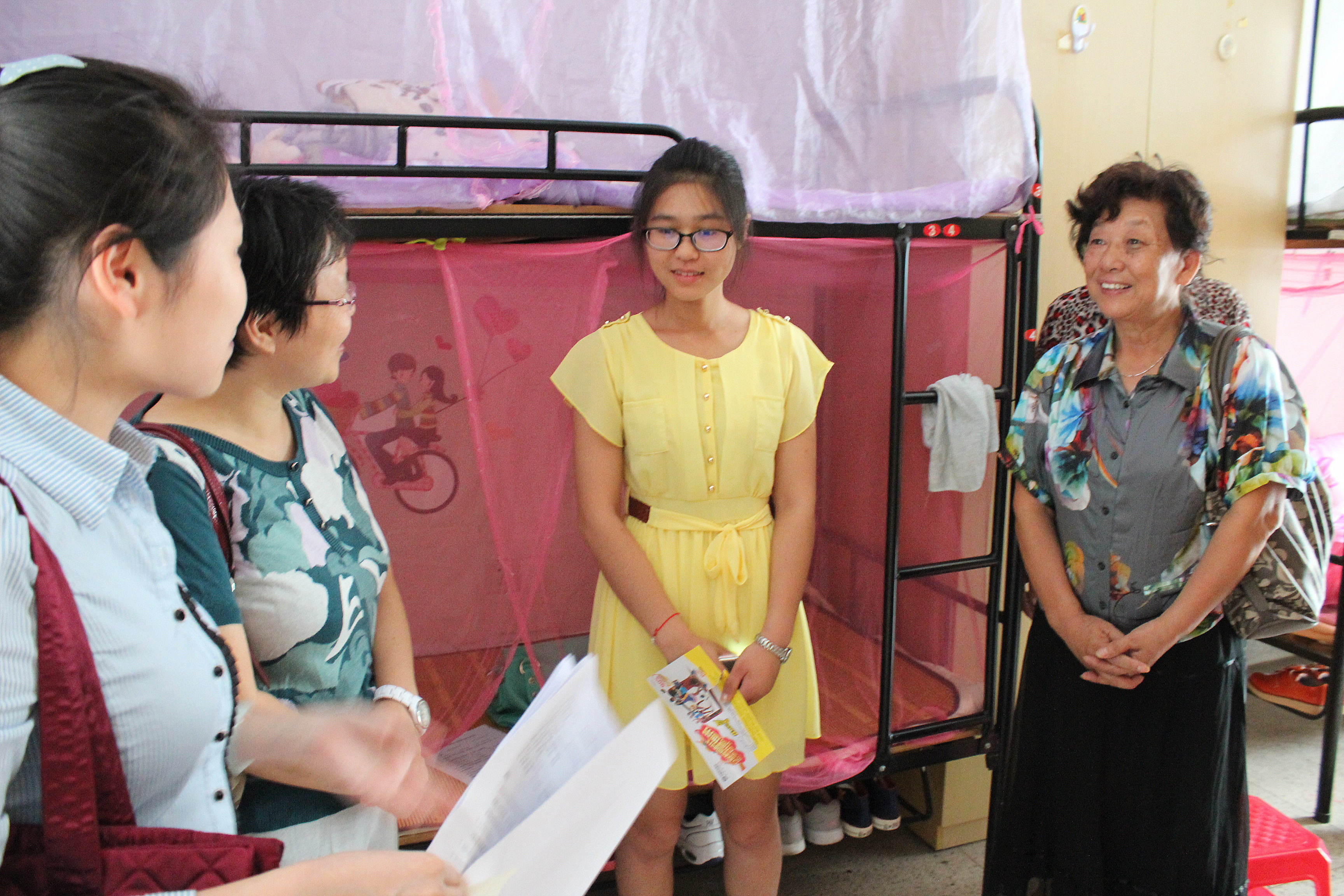 王建芬副书记和林玉华老师来到03栋宿舍,两位老师见到新生们首先进行了自我介绍,然后亲切地和她们交谈并询问家长们的行程安排,还关切地询问学生和家长对学校的伙食和环境是否满意。新生们还对注册中遇到的问题咨询老师,老师们都耐心地一一解答。在其中一个宿舍,有一位新生不小心将手刮伤,老师教导她如何正确处理伤口,细微之处体现了老师们对新生的关怀。