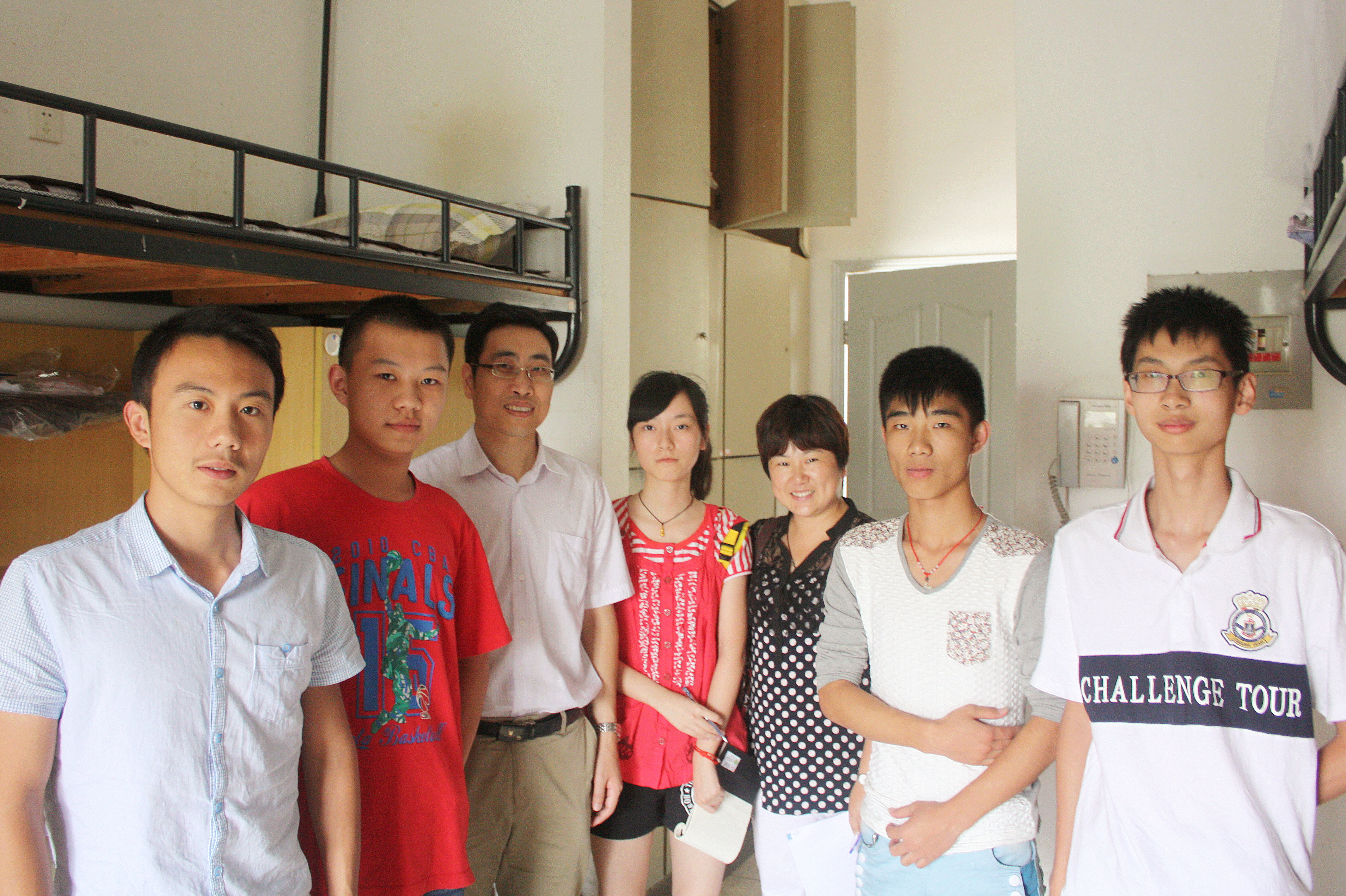 顾汉展书记和徐晔星老师主要对男生宿舍进行了参观与慰问,今年的男生有30位,可谓惊人。首先老师们来到了215宿舍,宿舍里四个男生愉快得交谈着,在看到书记和老师进来后马上暂停了交谈,礼貌地与顾书记和徐老师交流起来。顾书记亲切地询问了每个同学的老家,得知其中一位男生有脚伤,徐老师关切地提醒他不要剧烈运动。之后又走访了213、209、205等共八个男生宿舍。顾书记和徐老师也与一些新生家长热情地交流,家长对学校和宿舍的坏境很满意,徐老师还笑称这批学生是最幸运的,可以第一批享受到宿舍空调。顾书记和徐老师同时允诺家长孩子们会在学校里一切安好,自立自强,学会照顾自己。在209宿舍,在四个男生的强烈要求下,他们还与顾书记和徐老师进行了合影。