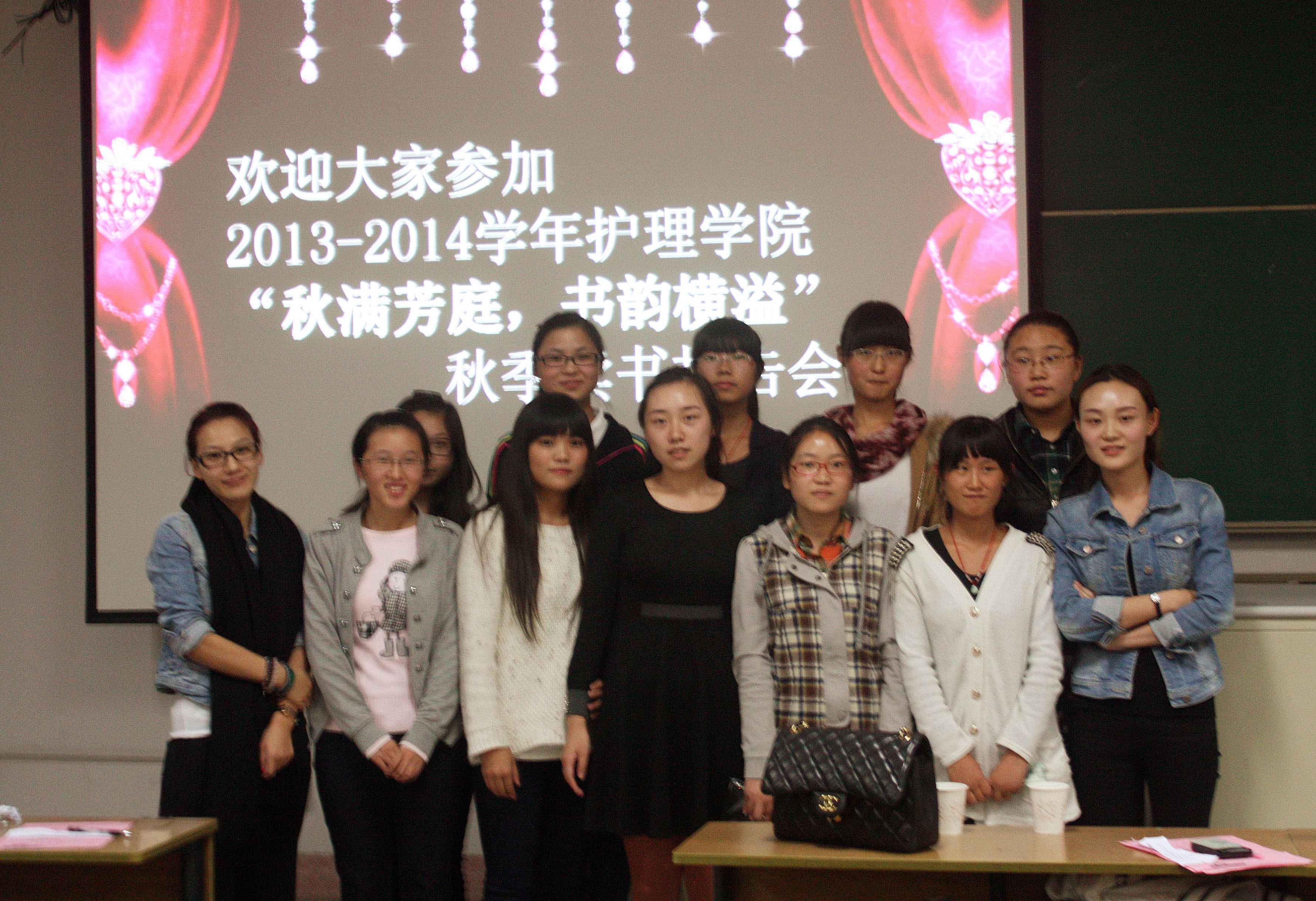 2013年10月21日晚,由米兰(中国)让运动改变生活策宣中心主办,2011级护理5班承办的2013-2014年度秋季读书报告会“秋满芳庭,书韵横溢”在K215举行。吴菲老师和付梦楠老师作为专业评委莅临了读书报告会,院学生会主席王玥,团总支副书记徐颖,蒲爱园院长杨兰婷和策宣中心主任蒋慧敏也作为专业评委参加了报告会。