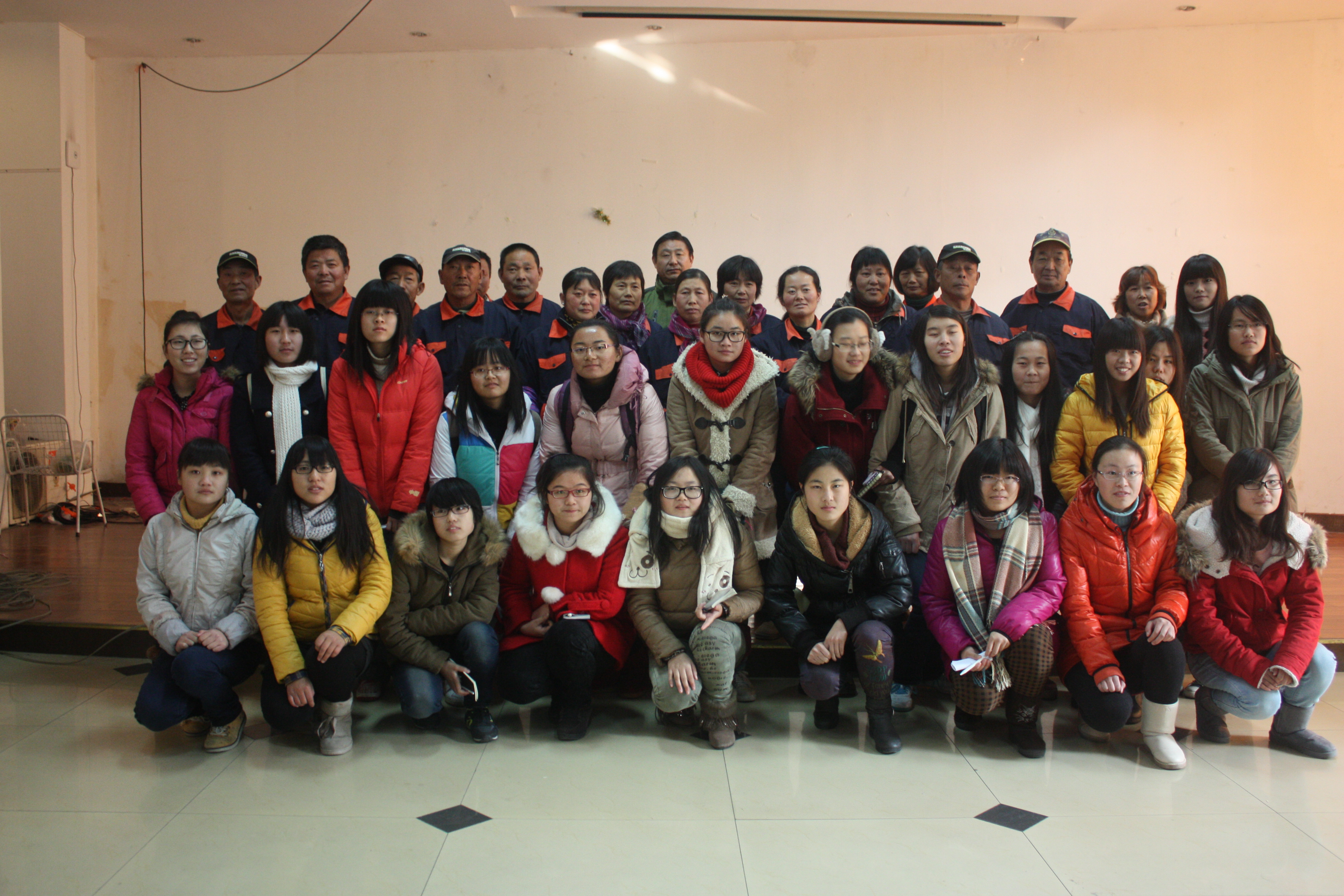 2013年12月21日下午一点半米兰(中国)让运动改变生活在大活多功能厅开展了慰问绿化工人活动,此次活动由策宣中心主任蒋慧敏组织策划,绿化工人代表张老师、全体绿化工人和米兰(中国)让运动改变生活各班同学代表参加。