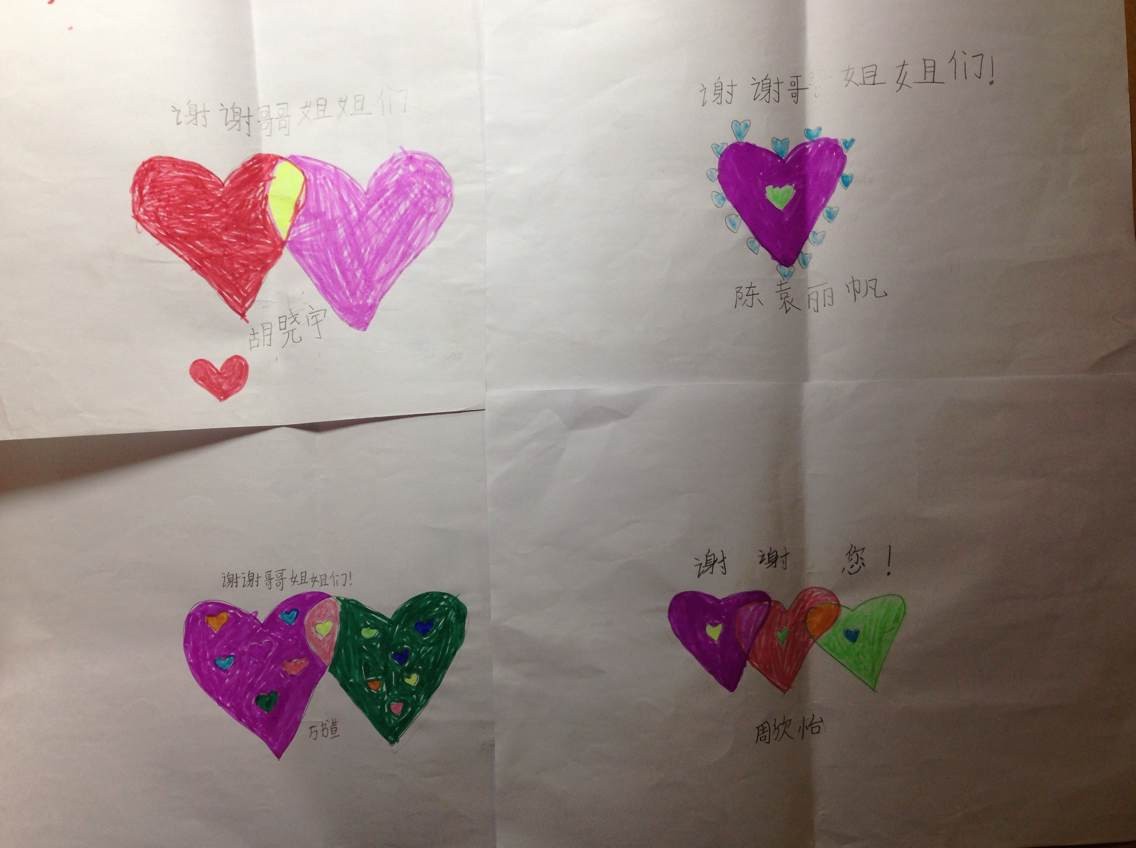 在与白马共和小学负责老师的沟通交流中,我们了解到这四位学生的冬季保暖用品因家中贫困比较单薄。于是,我院的同学们积极宣传,每人献出一点爱,很快募集到了资金。在2013年12月25日,我院将包括耳罩,围巾,手套,袖套等冬季保暖用品寄往了白马小学。五天后,受助的几位学生已经收到了用物,并通过负责老师向我们学院表达了感谢之情。新学期到来之际,还未能写出完整语句的四位受助学生,用水彩笔画下了他们的感恩之心。歪歪扭扭的署名,如同爱的音符,跳动在每个参与活动的同学心中。