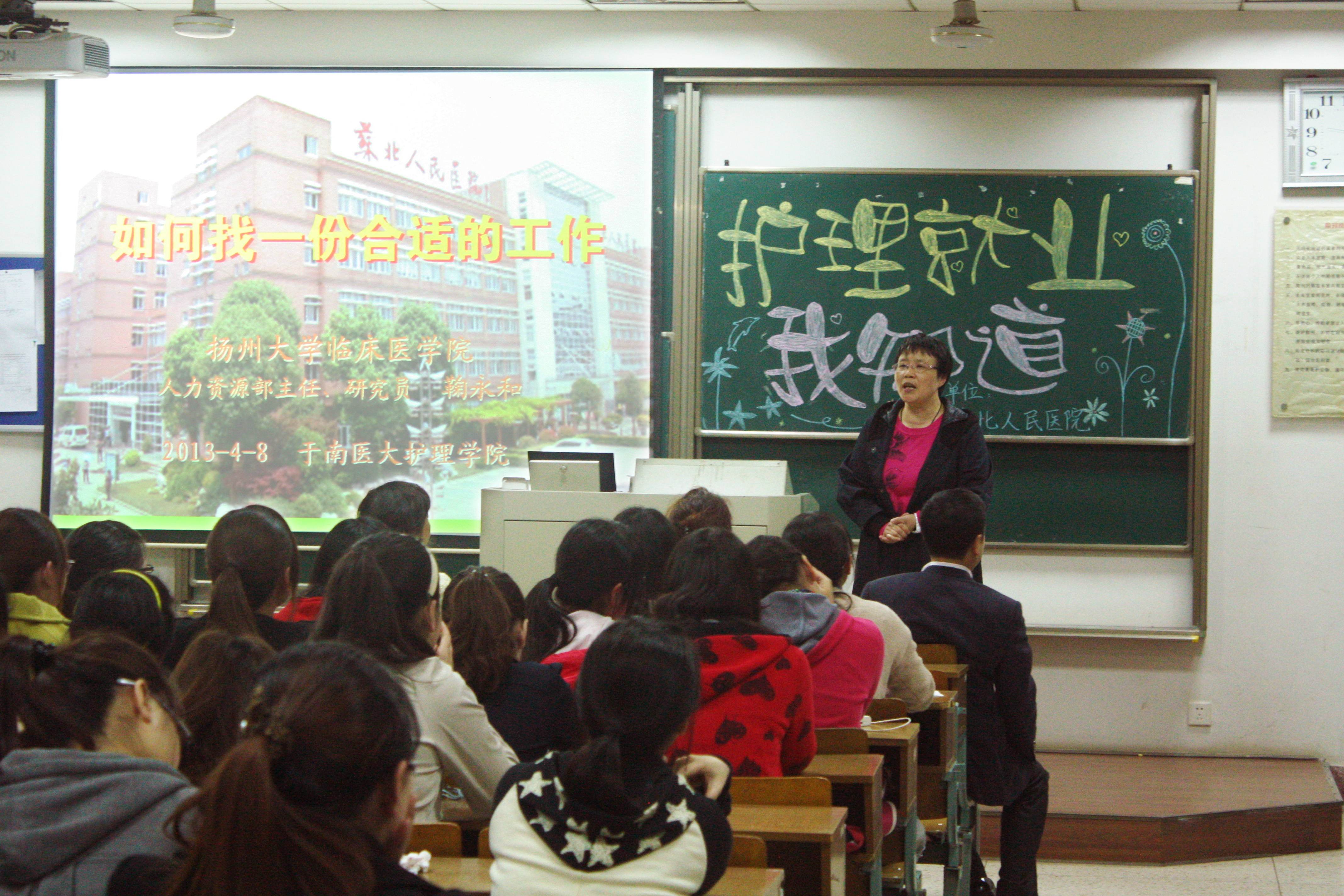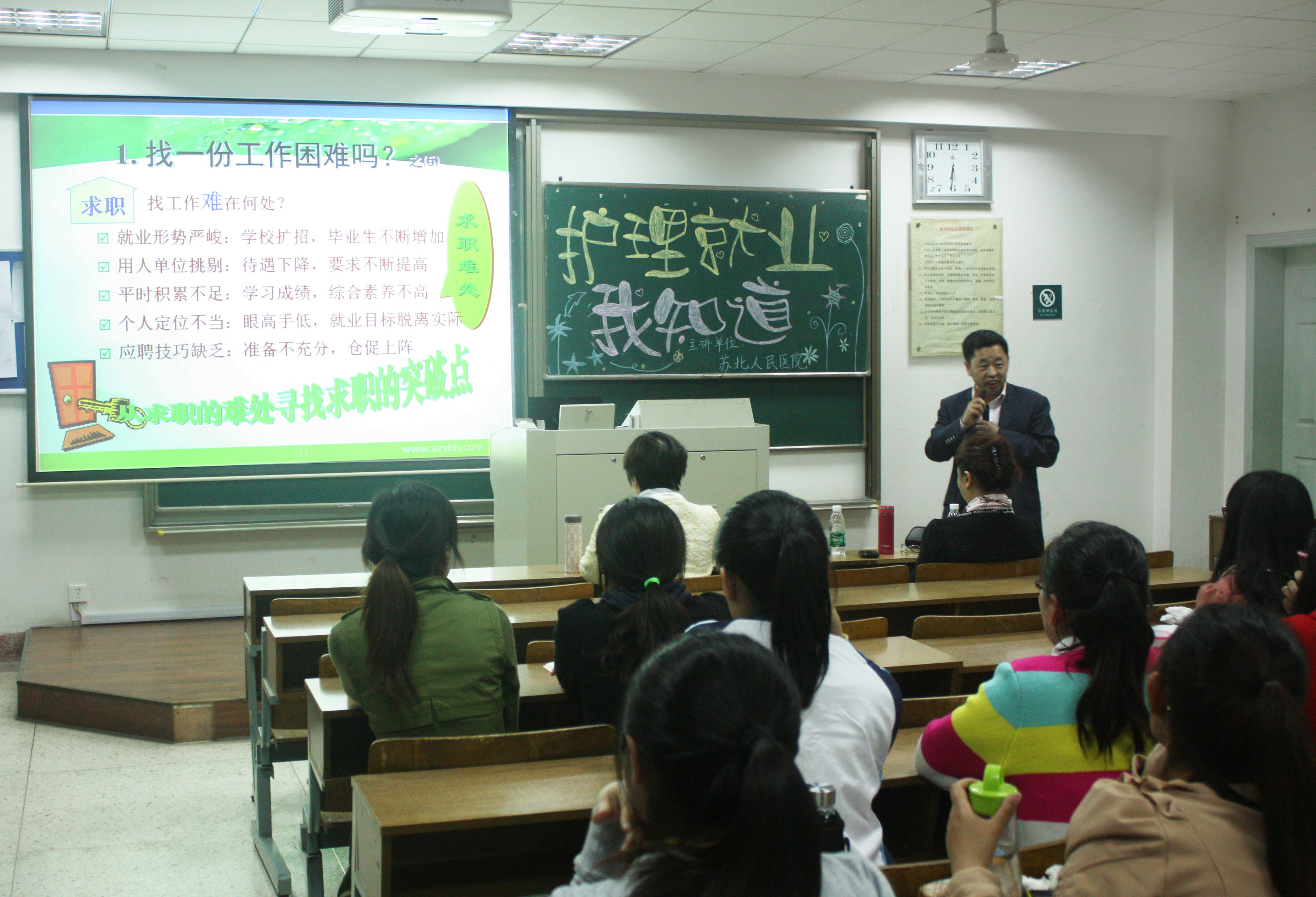 在讲座的最后,鞠处长向我们介绍了苏北人民医院的情况,并热情的表示希望我们有机会可以去扬州游玩和工作。听了他的讲座,同学们都受益匪浅,对护理专业招聘就业情况的方方面面多了很多了解。