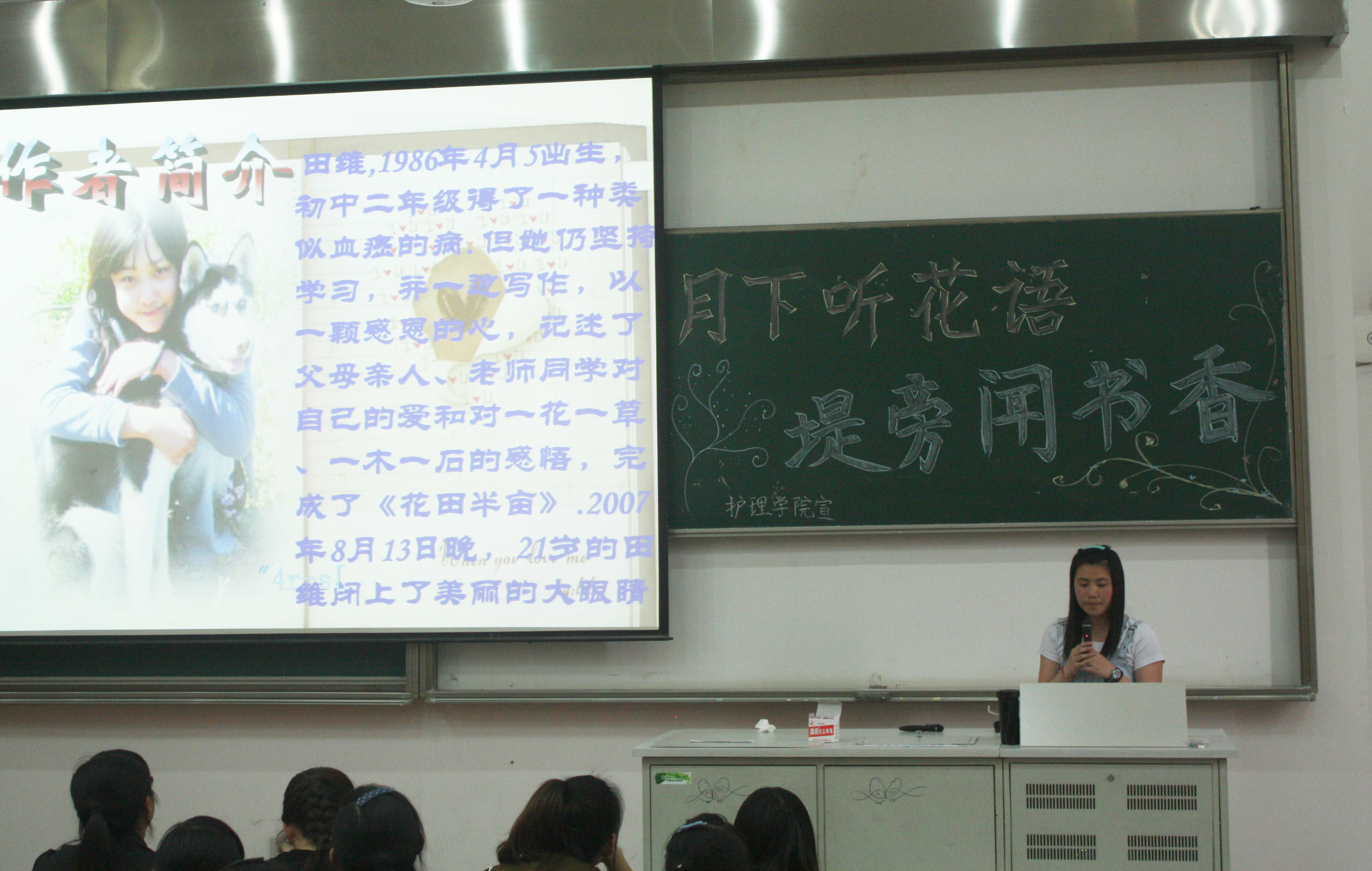 第一位上场的施浩庭同学为大家带来了龙应台的《目送》。龙应台用温柔的眼注视亲人,用细致的心关爱他人,用淡如水的笔书写世间百态。这是他的一本生死笔记,深邃而忧伤。由此,施浩庭同学想到,考上大学的学生就像挣脱牢笼的小鸟,他们只想越飞越远,却忽视了身后亲人的目光。到最后,他们千万次回头却再也找不到最初目送自己的身影。每一次家人的目送是成长,最后一次的目送却是永别,这就是生活和生命的本真。第二位上场的于小敏同学和大家分享了六六的《心术》这本书,这本书从信、望、爱三个角度诠释了人性的美、善、丑。听完于小敏同学的读书汇报,作为医学生的我们,更加相信未来,相信世界,相信只要拥有信、望、爱,明天就会更加美好。接着,吴心艳、曾敏同学向大家介绍了《不能承受的生命之轻》这本书,她们认为由生命之重换来的生命之轻才是真正的生命之轻。就像每一位伟大优秀的人物,必定都会有一段沉默的时光。