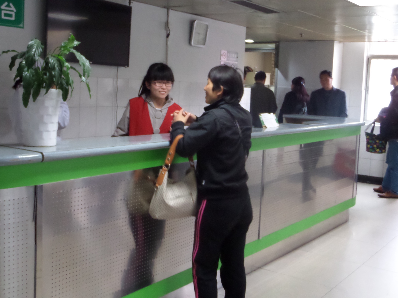 周末八点半的市第一医院病人不算太多,门诊大厅的挂号和收费处的队列也井然有序。偶尔有几位患者不太会用机器取化验报告,志愿者都热情地上前帮助他们解决的问题。九点之后,随着病人越来越多,志愿者的工作也开始忙了起来。“请问呼吸内科在哪里?”“彩超在哪里做?”“妇科在几楼?”患者们的问题像海浪一样一拨一拨向志愿者扑来,这可把大家问蒙了。由于之前只了解了二楼大厅的功能分布,却对其他楼层分布一无所知,志愿者们只能无奈地一次次求助老师,老师也耐心地指导志愿者。正所谓熟能生巧,在多次的提问中,志愿者大致熟悉了所有科室所在的楼层,后来的患者们的疑问大多数也都能顺利回答。