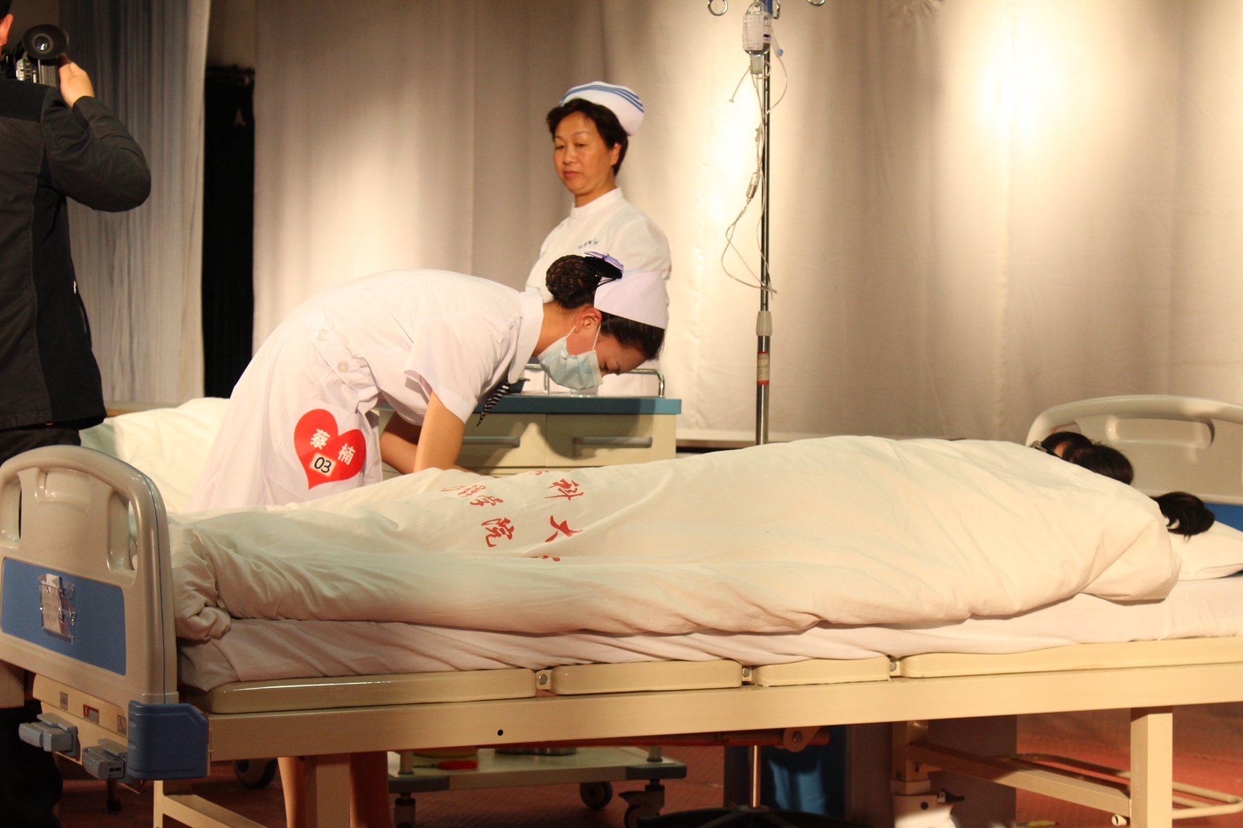 致辞之后,护理技能操作大赛在院内科教研室嵇艳老师的主持下展开。赛事共分为三个部分,依次为心肺复苏,无菌操作技术以及静脉输液。每个部分分别有四位同学参赛,并相应的有护理部主任在旁考核打分。心肺复苏的操作是在模拟公园场景下的紧急抢救,谢雅雯,李佳,华熠、张天资四位同学的动作规范而又迅速,东南大学附属中大医院护理部主任李国宏老师评论说:“她们的一举一动让我感动,从她们专注的神情中我体会到了背后的责任。”第二部分是考核参赛同学在模拟治疗室中的无菌操作技术。嵇婷婷等同学操作时一丝不苟的态度更是令人啧啧赞叹,省人医护理部主任顾则娟老师的一句话:“认真工作中的白衣天使最美”赢得在场所有人的热烈掌声。最后的比赛项目是静脉输液,王涛涛等4位同学的动作和语言完美地展现了她们扎实的基础知识和娴熟的操作技能,输液前的检查看似繁琐却来不得丝毫马虎。鼓楼医院护理部主任陈湘玉老师对于选手的表现给予了高度的肯定与评论,她说:“她们用评判性思维在专业领域中进行着创造和升华,专业价值得到了淋漓尽致的呈现。”