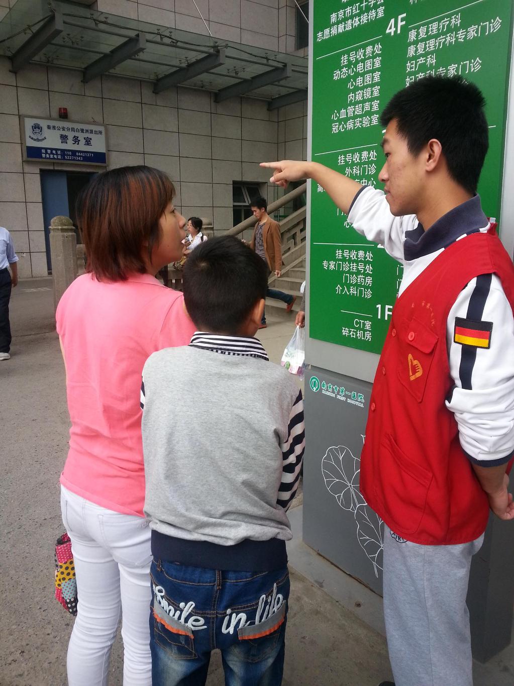 志愿者们刚到的时候医院里就诊的病人还不是很多,被分配在导医台为患者指路的同学虽然工作有点无味,但仍充满激情和耐心。他们遇到不懂的问题就向带教的护士姐姐请教,很快,他们就可以自己去解决一些问题了。来医院就诊的患者也慢慢认可了他们,在得到解答以后,都会说一句谢谢,听了之后让人觉得心里暖暖的,同时也有一种被认同的感觉。每一位志愿者都在自己的岗位上努力地工作,他们忙于转角服务,内外科服务,电梯服务等等,脸上挂着微笑,用真心真情帮助来求医的病人们。他们为自己能够为医院,为患者提供一丝帮助而欢心雀跃。