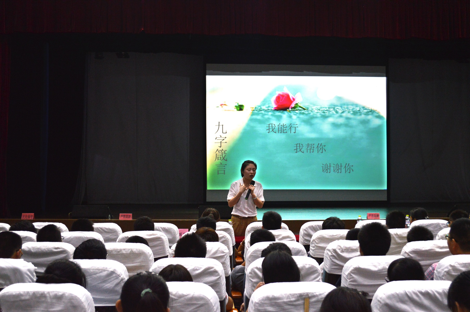 会议的下一项进程是由王丽丽老师结合幻灯片讲解学校生活的注意事项。王丽丽老师制作的幻灯片十分引人入胜,她用亲民欢快的语气向大家介绍了以下几点内容:首先是介绍米兰(中国)让运动改变生活的四位辅导员,其次是让同学们迎接宿舍对应学姐学长,让他们解答自己的困惑,三是介绍学校主要的规章制度,四是要求同学们必须注重文明礼仪,做到时刻微笑,第五点是强调了在校与出校的出行安全,最后一点是交待了新生近日的日程安排。王丽丽老师最后送给了新同学们九字箴言:我能行,我帮你,谢谢你。王丽丽老师的幽默风趣和对同学们的关心引起了大家诚挚的掌声。