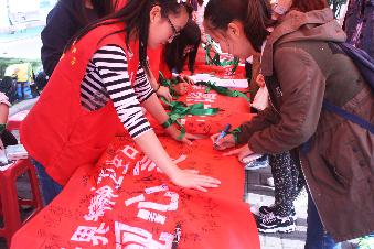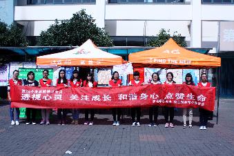 早在宣传日之前,以“透视心灵,关注成长,和谐身心,点赞生命”为主题的横幅就挂在校园,营造了此次活动的氛围。上午10:00志愿者就到场进行活动的前期准备,将横幅揭下来用于签字活动,拿出提前准备的明信片、笑脸胸牌、绿丝带以及宣传单页,开始向陆陆续续下课的同学介绍活动的意义,同时邀请他们参与活动。