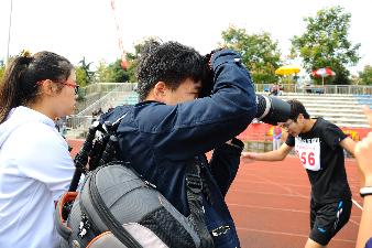 而在看台边,活力四射的啦啦队员在音乐节奏的带动下舞动手中的旗子,为运动员们加油鼓劲。虽然额头渗出了细细密汗,但想到能给运动员加油,她们未曾停歇。坐在看台上的观众都很激动,随着赛点的出现和停歇,看台边时不时地爆发出加油呐喊助威的声音。他们的呐喊,是运动员们最大的动力。坐在前排的通讯员们时刻关注着赛点,记录下赛场上的点点滴滴,同时也用他们的笔为运动员们呐喊助威。在各场地周围都一直穿梭着穿着红色马甲的志愿者,他们努力维持着秩序,为公平有序的比赛尽自己的一份力量。
