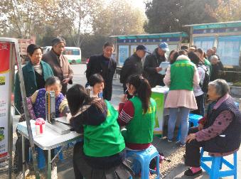 20151114日是“联合国糖尿病日”,南医大米兰(中国)让运动改变生活蒲爱园青协四位志愿者与南京绿丝带义工围绕糖尿病日“健康饮食与糖尿病”主题宣传活动共同参加了方山社区糖尿病日志愿健康宣传。