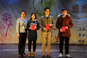 亚东奖学金一直致力于支持我校优秀同学的发展,为他们未来的求学之路提供有力的帮助,12级的施雯雯等三位同学以及13级的郭立益等三位同学、14级的朱涵菲等三位同学获得了此次奖学金。“春蚕到死丝方尽,蜡炬成灰泪始干。”老师是知识的象征,是爱心的使者。他们用生命呵护我们成长,用清贫诠释人生。他们将我们引入知识的殿堂,帮我们把握人生的航向.他们为我们做出了行为的表率,用爱心托起了明天的太阳。我们要感恩老师给予我们修养和文化,感恩老师给予我们放眼世界的慧眼。丁亚萍、李现文、钟亚萍三位老师被授予最美教师的称号,虽然他们没有来到现场,但是他们用视频传达了对同学的关心以及对学院的感谢。唐慧婷、羊洋、嵇艳、赵春华四位老师以及十六名学生用歌唱和手语的形式向我们展示了《和你一样》。父母给予我们生命,我们在他们的关爱中成长、成才、成家立业。感恩父母就是懂得孝顺。孝的源泉就是爱,爱是父母与子女之间剪不断的纽带。父母之爱是无私的,它沉浸在万物之中,充盈于天地之间。顾芳臣、吴凤怡等十三位同学用暖心诗画的形式表达了对父母的感激之情。音乐小品《长大》由赵康等17人演绎,诠释了父母对儿女们不变的爱。