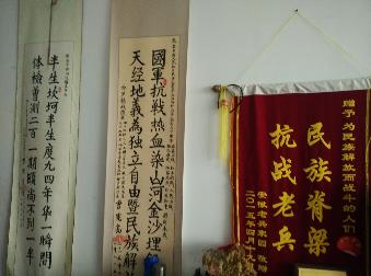 志愿者们把买来的心意放在桌子上,自报了家门。爷爷热情地请同学们坐下,并主动与同学交谈了起来——说了他当时抗日的光辉事迹——200多人打死了500多的日本兵;打下来几架飞机;一生从未打过败仗;位居纪委的高位……曾爷爷还给同学们看了手相,告诉谁谁谁适合做文官,谁谁谁适合做武官,大家一起其乐融融。同学们看到墙上挂满了锦旗,还有好几幅字,十分欣喜和敬佩爷爷的书法,于是爷爷给同学们展示了他的好几幅作品,还有证书。可爱的爷爷还向同学们秀了他丰富的知识——背诵了出师表等文章,又与同学们讨论与分享了自己对古代文人的喜恶。