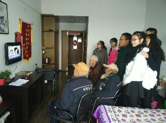 到了近10点,南京绿丝带的义工带着南京晓庄学院的同学们来看望老兵们,因为今天是南京大屠杀死难者国家公祭日,大家把3位老兵聚在一起看直播。