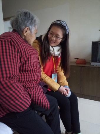 来到老人居住的房间,设备齐全,老人们盖着两床厚被,床又暖又软。坐在奶奶床边,奶奶不停地关心我们衣食住行,叮嘱我们也要穿暖吃饱,虽然他们一半家乡话一半普通话模棱两可,但是那份关爱的心意却踏踏实实得传进我们心里,十分温暖。从80011:30,时间在飞逝,临走前,志愿者们和老人们在大厅举行了告别仪式,并拍照留念,然后依依不舍地离开了。