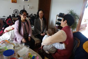 第一个服务对象是一个奶奶,她的眼睛看不清东西,平时在家带带孙子,也不好出去走走。当我们敲响她家的门时,开门的是她的媳妇,她说奶奶出去买酱油了,过会就回来,于是我们就有点好奇了。我们坐在她家等了一会,没多久就听见开门的声音,我们赶紧起身去看,不由得惊讶,好年轻的奶奶!好有活力的奶奶!奶奶回来没多久,她的媳妇就去上班了。于是奶奶抱着孙子坐下来和我们聊天。有一个六个月的小孩,很快我们就和奶奶聊热络了起来,时不时地逗逗小孩子,大家都很愉快。