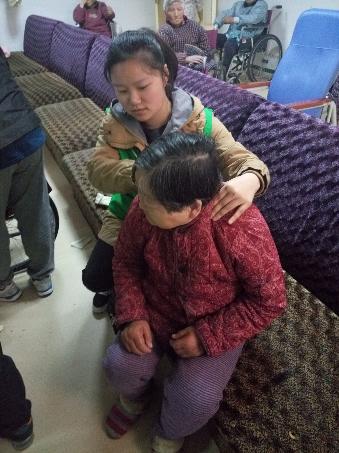 在交谈的过程中,志愿者们发现好多老人的指甲似乎好长时间没修剪了,所以就各自拿了指甲刀帮老人们边修指甲边聊天,在聊天的过程中发现好多老人其实都是有儿女的,但是由于各种原因不能呆在他们身边所以他们感到孤单,有个奶奶说:平日里我不跟别人讲话,别人也不跟我讲话。她觉得没人能懂她,在交谈的过程中她说她的儿女在上海,就跟没有儿女差不多,一年才过来看她一次,她现在眼睛也看不清了,所以导致她消极的心态,觉得自己活着就是个累赘,志愿者们不断安抚她,希望她开心的过活每一天。