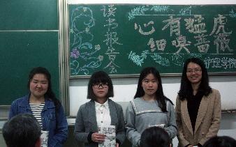 首先上场的是来自14级护理3班的夏苇怡同学,她以一句“谁的青春不迷茫呢?”开场,用幽默风趣的语言为大家讲述了《麦田里的守望者》一书,既让大家看到人性的虚伪也看到了理想的美好。伤感的纯音乐缓缓响起,15级护理7班的于玲同学用略带伤感的语调带着大家去认识了《陆犯焉识》中的那位伤感的主人公陆焉识。他的爱情、他的自尊。最后于玲同学借此告诉大家要不忘过往,珍惜当下。接着上场的14级护理10班的周文雅同学,她以木兰花为引为大家展现了一位处在动荡不安的社会的智慧女子——姚木兰,并将《京华烟云》中木兰的爱情展现在大家面前。音乐声再次响起,来自15级护理2班的李楠楠同学和大家一同分享了《民国时期的爱情》这本书,同学们透过浪漫的民国看到了那些浪漫的爱情。鲁迅与许广平具有传奇色彩的师生恋情、林徽因与梁思成、钱钟书与杨绛……“不问值与不值,当爱情遭遇民国,爱也爱得那么有气质。”