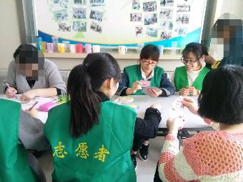 准备好物品,安排好人员以后,志愿者分成两队,分别进入康复病区和第三病区。进入病区以后,刚开始由于病人们刚睡醒,还没什么热情,但志愿者们还是没有减退热情——热情地邀请他们加入到游戏当中,有的邀请她们下棋,有的邀请她们打牌,终于在听到要画画时,她们有了兴趣,接着,一个,两个都热情地加入到志愿者的游戏中。有一个阿姨还热络的要给志愿者扎辫子,先是给她编了一下马尾,后又找梳子要给她扎头发,说头发扎低一点好看,志愿者都亲切的与她互动,让她扎辫子,还邀请她与其他人一起打牌。活动中,志愿者尽量顺着病人们的心意,例如:打牌时,有时志愿者刻意地输给病人,让她们开心,间或赢一局,让她们不至于觉得有什么对她特别之处,不让她们起疑——志愿者太笨或者故意让她。大家在一起,有的打牌,有的下棋,有的画画,有的看书,有的折纸,还有的拼图……好不热闹。