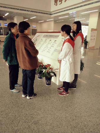 我们的志愿时间是下午2:00到4:30,到了医院换好志愿服装后,在老师的带领下先熟悉了下医院环境,然后我们分工明确后便开始了服务。在这两个半小时内,我们一直坚守岗位,为前来就诊的人热情地提供力所能及的帮助。韩朱晶和曹悦在大厅门口引导,李超在一楼大厅引领,彭亮、赵美玲和张敏则分别在二三四楼指引。
