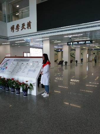大家的志愿时间是从上午7:30到11:30,在这四个小时的时间里,志愿者们一直坚守岗位,为患者及家属提供各种帮助并介绍医院相关环境。徐阳和潘李娜同学主要在一楼大厅导诊,任务就是当患者来看病,就告诉他们先去咨询台分诊,填个人信息,然后再去挂号台挂号缴费。另外,有病人问路时能够告知他们科室如何走等等;王芳和方颖同学主要做的工作是向患者指引内外科门诊的方向、挂号收费地点(包括一楼和二楼的)、各种检查室的位置(如内镜检查、B超、静脉采血、CT等)以及帮患者取检查报告等;陈迎玉同学主要是指引病人到相关科室就医;刘倩同学是作为一名咨询向导在一楼后厅工作,主要就是告诉寻问者去哪里做检查,去哪里看诊等。