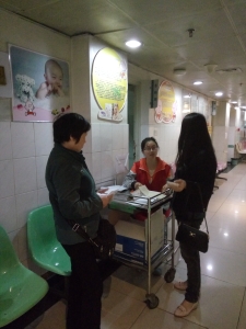 今天,负责门诊大厅的仍是顾梦颖和郝雷雨两位同学。她们两个人非常的热心,经验充足,主要负责导向咨询。遇到前来咨询的老人,她们会很耐心的向老人解释。有时看到脸上有疑惑的患者或者患者家属,她们也会主动为他们答疑;负责内科的是晁卓同学。由于内科里的人比较多,晁卓同学在志愿活动时出现了不少问题。但是,最后在老师的帮助下问题还是得到了解决;负责外科的是刘雪莲同学,她做事认真,充满热情,获得了大家的一致认可;负责五官科的是周蓉和徐清同学。她们两个凭借着以前的经验解决了不少患者及其家属的问题。