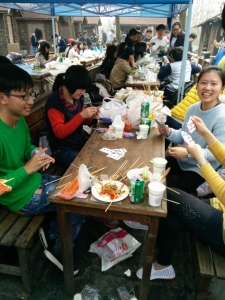 在绿博园门口,同学们纷纷拍照留念。在烧烤园里,班长王慧和生活委员方晓雅同学安排了烧烤事项后,同学们拿出烧烤材料,铺好锡箔纸,由擅长烧烤的张科和朱海宝同学“掌勺”,气氛十分融洽愉悦。继而,同学们去了游乐场,并进行了吹气球比赛、“护花使者”PK以及真心话大冒险等游戏。获胜者将获得礼品。
