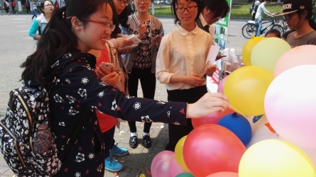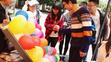 才十点半,上午没课的小伙伴们就已经忙碌着借来了桌子板凳,帐篷和白板等工具,开始了社团活动。社员们准备了许多小礼品,只要扫码,添加社团的官方QQ,就可以进行扎气球抽奖。奖品都是方小雅同学提前一天采购回来的。值得一提的是作为三等奖的书签,背面有社员们连夜写下的有关生殖健康的小贴士,真是可爱又实用。