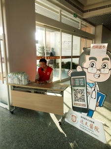 2016103号,国庆假期间,志愿活动依旧进行,志愿无界限。米兰体育15级的一名学生来到逸夫医院做志愿者。