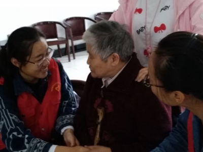 其中两位同学走到一位老爷爷面前,有点羞涩地说:“爷爷,我们可以和你聊聊天吗?”细致的老爷爷一下子就看出了志愿者们的局促约束,指着身旁的椅子笑眯眯地说:“好啊,坐呀,坐,你们是第一次来吧。”待志愿者坐下后,便率先开始了讲述,虽说这位爷爷已经八十几岁了,脸上满是岁月的吻痕与人事的磨纹,但依然很有精神,和志愿者们骄傲地谈论着他的儿子们还有孙子的努力与成就,但是,在他骄傲的眼神中,志愿者们又分明看到了一抹思念与孤寂,他们不由得握住了爷爷微凉的手,想要连同他的内心一起温暖,老爷爷接着又告诫志愿者,一定要注重身体,努力学习,有所成就,回报祖国,谆谆教诲,显示出他瘦弱的身躯里承载着的是厚重的灵魂,这样的他,又不由得让志愿者们敬佩。