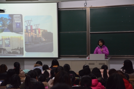 随后,朱姝芹老师向同学们介绍了她访问学习的大学——Western。朱姝芹老师首先通过PPT向同学们展示该所大学的校园文化,包括学校的标志性建筑、文化墙以及招生方式等。朱姝芹老师还和同学们分享了她在大学里的一些照片。她向同学们分别介绍了该所大学的商学和医学的课程设置及上课方式,她告诉同学们,这所大学上课的时间很少,主要是得靠自主学习,她也提出打算到国外留学的学生一定要学好英语。