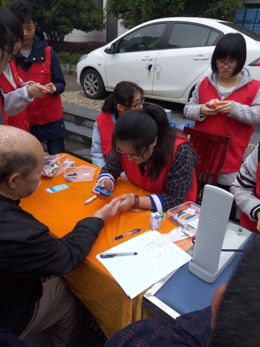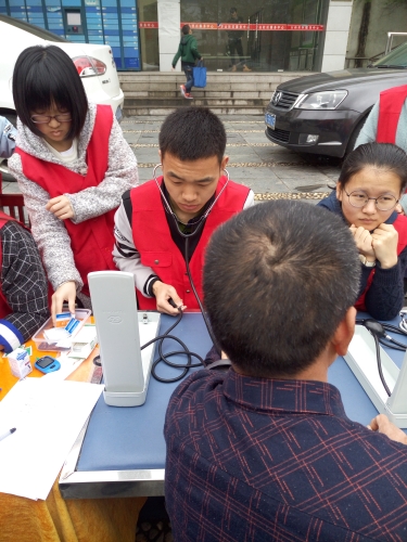 在201749日上午,阴雨蒙蒙、寒气逼人。来自米兰体育的15级李楠楠、陆钰玲带领着16级刘谦、刘海芹、陈雪涵、赵强一行人来到方山社区进行义诊活动。此次活动提供量血压和量血糖,前来参与的居民络绎不绝。