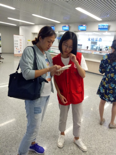 志愿者们准时在医院大厅集合,做完签到工作后,大家都换上了医院的志愿者服,赶到自己所在的岗位开始了忙碌的志愿工作。