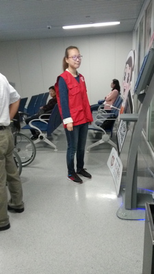 据梁金燕同学回忆说:“刚刚到达检验科的时候,站了一会,就看见一个老爷爷推着一个老奶奶站在体液检查的门口,就走过去询问,原来是爷爷奶奶想要去进行血液检查,在这里等女儿来。爷爷奶奶在的位置并不是进行血液检验的,于是就带爷爷奶奶到拐角处血液检查的地方。”期间打印检查报告的机器出现了好几次问题,梁金燕同学都能够立即向医务人员反映,并热心指导患者到对面窗口让医务人员打印。