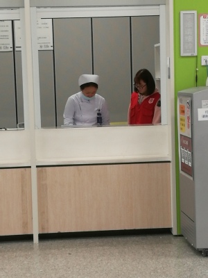 本周五袁佳琪,缪晨晨为一组进行逸夫医院的志愿者活动,缪晨晨和袁佳琪到达逸夫医院进行签到,穿上红色志愿马甲到达自己的岗位开始履行自己的职责。