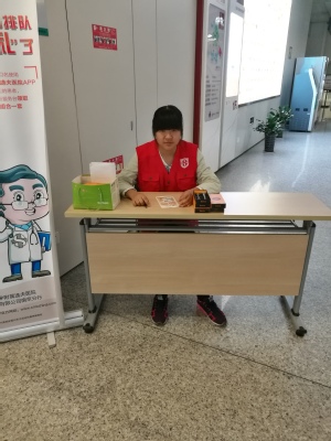 缪晨晨是在一楼帮助病人的咨询服务,病人就诊诊区指引,协助患者填写完善个人资料,检验报告打印,护送行动不便的患者就诊。其中最重要的一项是向病人推广逸夫医院APP,方便病人的就诊,给予病人更舒适更方便的服务。也许病人们并不知道这个APP的用处或者病人甚至都不知道这个APP的存在,此时就需要志愿者的主动上前推广耐心讲解。在这下午三个小时的志愿服务中,她已帮助六人成功注册缴费并会自己使用APP,最后病人也接受了赠送的小礼品。