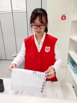 负责App岗位的同学耐心地为患者讲解逸夫医院app的用法,推广app的使用,有个阿姨很着急,说她没带现金,而且要赶在三点半之前去接孩子放学,但是她又不会用手机预约挂号,志愿者很负责地为她讲解流程,很快帮她挂好号,阿姨很感谢志愿者。大厅岗位的同学为不认识路的人们指引方向,在自动取号机旁边为患者们扫条形码打印检查报告;负责影像科的同学在影像室帮助行动不便的老奶奶检查、打印影像报告等;负责B 超岗位的同学引导患者扫码排队候诊,维护秩序等。大家都忙着各自的工作,没有懒散,工作非常地严谨,认真对待每一位需要服务的人。来自4班的卜雪同学与同行的志愿者分享了她这次活动的经历。