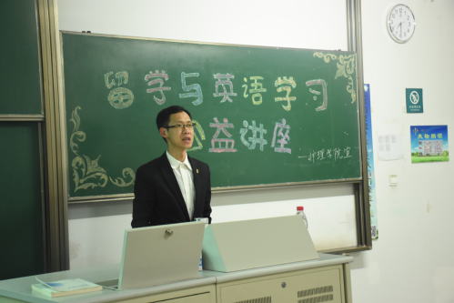 活动伊始,主持人简单地介绍此次讲座背景后便邀请国教院郑宇院长开始今晚留学与英语学习的公益讲座。郑院长首先大致谈了今晚讲座关于留学,主要是涉及交流访学项目和出国访学的一些经验与感悟。继而,郑院长提问:“为什么要去留学?”,在同学短暂交流之后,郑院长引用经典旅游广告用语“身未动,心已选”,并且从学习知识、开阔眼界、改变人生等六点来全面诠释留学的目的。他指出:“国际化已是当今世界一种趋势,中外文化也在不断地融合,而大学是培养人才的基地,所以学生的境外学习也是国际化的一项重要指标。”其次,郑院长通过列举的境外交流访学的一些项目讲解了如何申请对自己合适的出国留学项目,他从各个项目组成如交换专业、交换时长、交换内容、申请条件及往年参加这些项目的同学的事例做了详细的介绍。最后,郑院长向同学们展示了往年参加项目的同学的留学相片,并用“Where is a will, there is a way”结束了讲座。